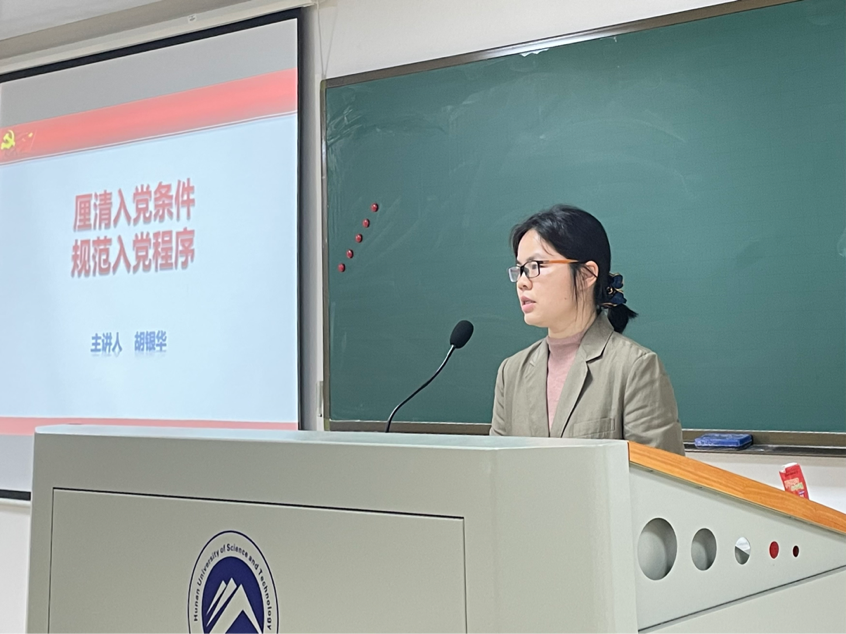 2023年4月11日下午,2023年上半年入党积极分子培训班第二讲在敏行楼C412顺利举行。第二员工党支部书记胡银华以“厘清入党条件,规范入党程序”为主题,引导入党积极分子端正入党动机、摆正入党态度,全面了解入党流程,积极向党组织靠拢。