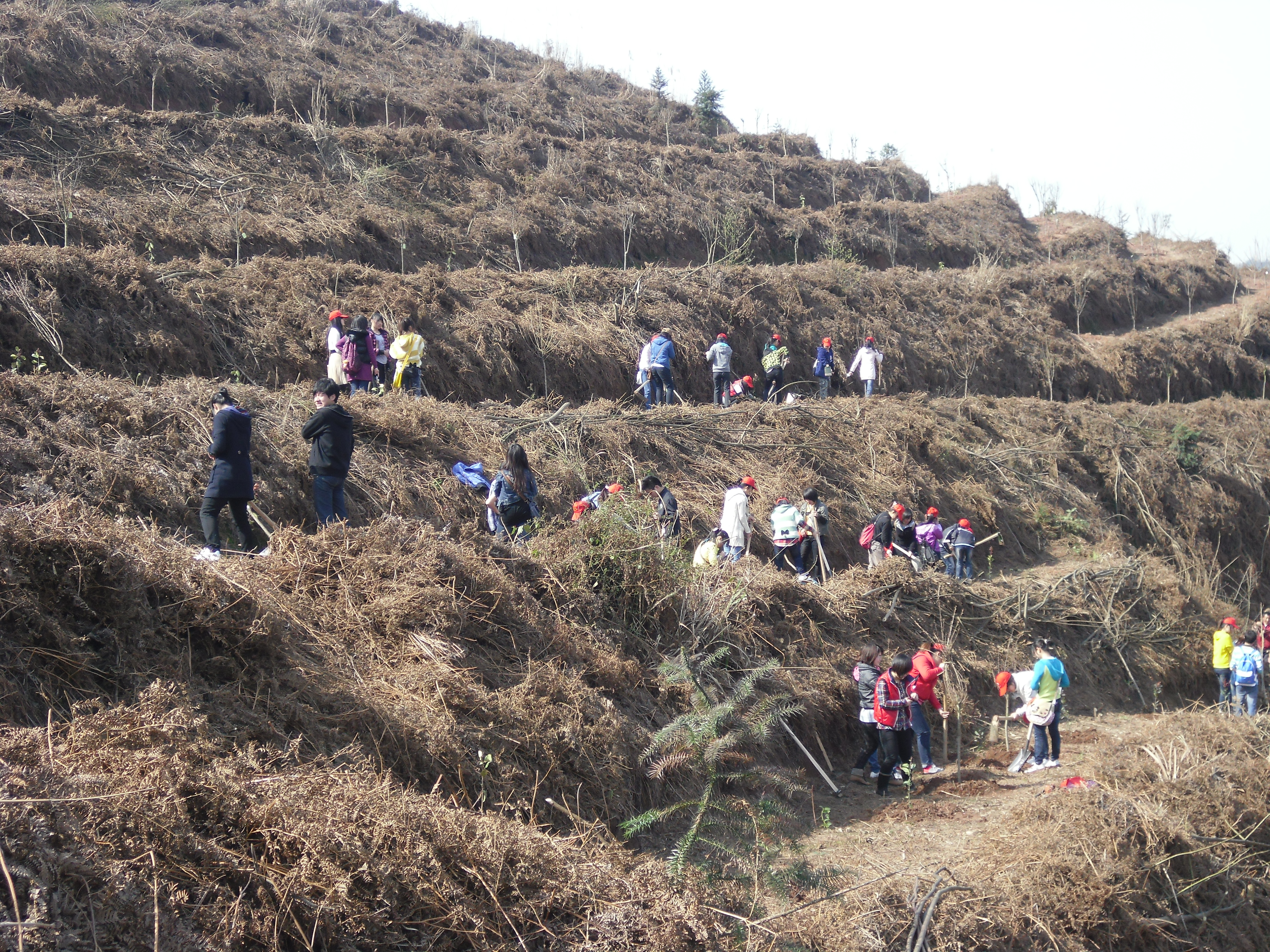 基地上呈现出一排热闹的景象,只见点点红色(志愿者帽)满山遍野,大山显得更加富有生机。