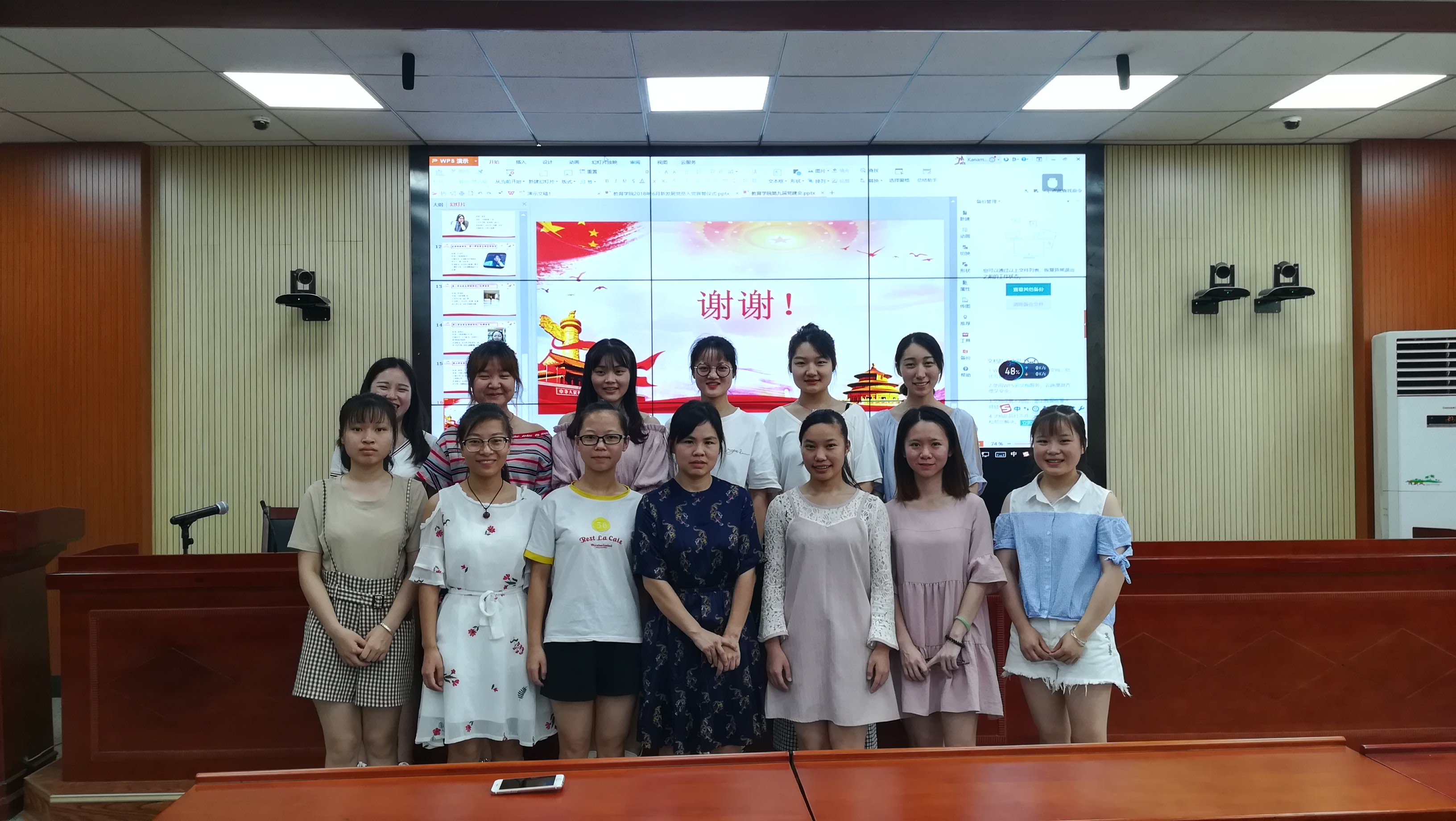 首先进行的是2018年6月新发展党员入党宣誓仪式。在全体起立奏国际歌之后,由研究生党支部书记曾玉云同志宣读本次新发展党员的花名册。接着是公司优秀党员代表黄馨慧同志领读入党誓词,坚定的声音代表着向党的决心。在宣誓过后,公司正式党员吴晨茜同志及本次新发展党员颜晶同志代表发言,她们在学习、工作、生活等各个方面都发挥先锋模范作用,以严格的标准要求自己,为党的事业贡献自己的青春和热血。最后由本科生党支部书记胡银华老师发表讲话,她首先欢迎和祝贺成为新发展党员的同志们,并且提出了自己的几点期望,希望每个人都能够提高自我,积极学习,争当员工表率。