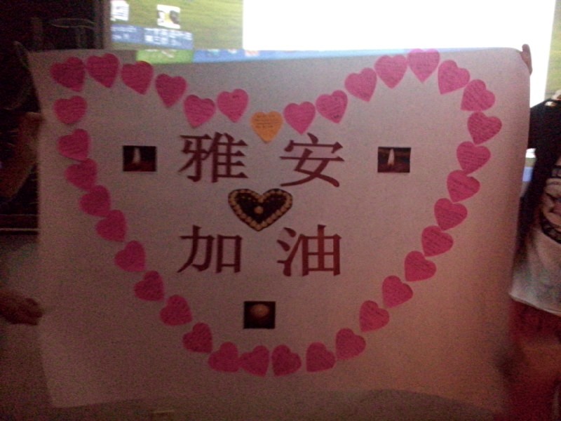 “相信大家此刻的心情都很沉重,很多感情都难以溢于言表,那么我们就用手中的笔写下来吧。”小学教育系党支部组织委员林珊同志要求大家把想说的写在小卡片上。在座的党员同志都提起手中的笔,认真的写下心里最真的祝福。“雅安,加油!”“一切都会过去,坚强!”“灾难提醒我们要好好珍惜身边的人……”一张张小卡片承载着不同的祝福,拼成一个大大的爱心海报,表达着在座党员同志共同的心声:雅安,加油!