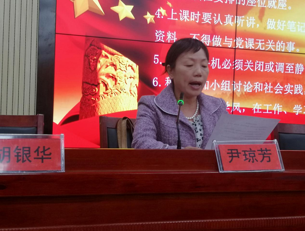 随后,尹琼芳老师向学员提出了培训班纪律要求,希望各位学员在培训期间能遵守各项规章制度,在工作、学习和生活中做先锋模范者。正式党员代表金婷发言,她强调了入党积极分子培训在入党积极分子发展过程中的重要性,并期望入党积极分子通过此次培训,在思想认识、政治觉悟、党性修养方面都能够得到提升,早日成为一名光荣的共产党员。 学员张丽晶同学代表本期学员向党组织做出了“坚定理想信念,勇担时代使命,做新时代的弄潮儿”的郑重承诺。