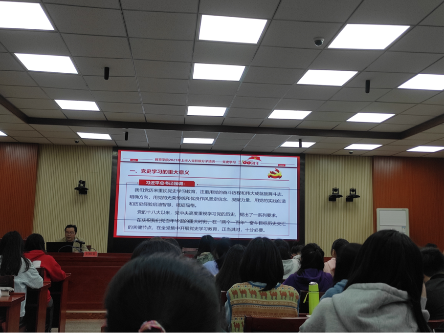 4月25日15:00,2021上半年入党积极分子培训班在第八教学楼308学术报告厅举行首次党课学习,全体学员认真听取了公司党委副书记刘辉亚为入党积极分子讲授的“党史学习”主题党课。