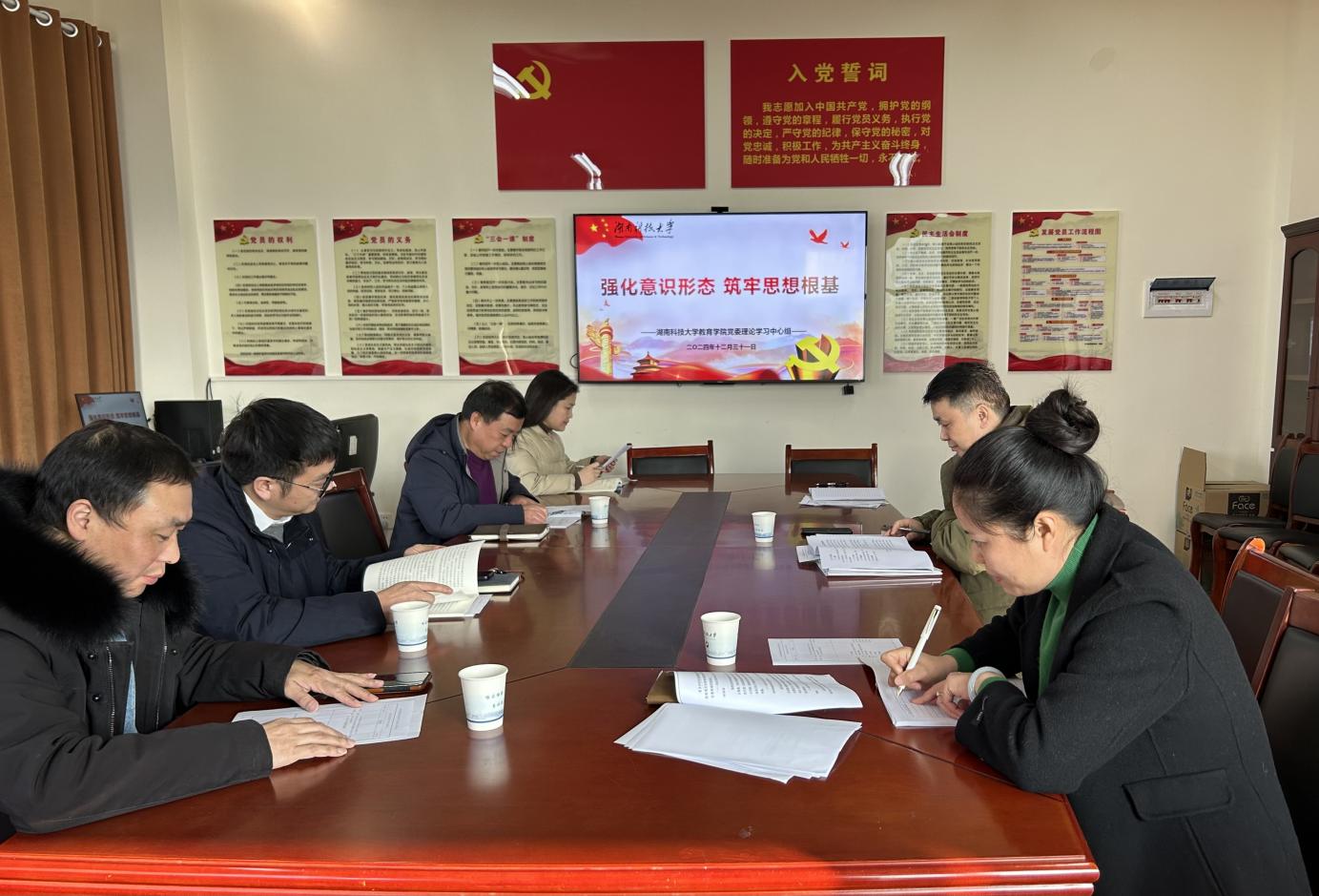 与会人员认真研读习近平总书记关于意识形态工作的重要论述、《习近平新时代中国特色社会主义思想三十讲》第十九讲:建设具有强大凝聚力和引领力的社会主义意识形态以及《习近平文化思想学习纲要》等内容。文红梅、陈京军领学相关内容。