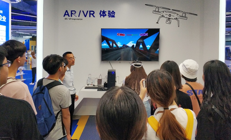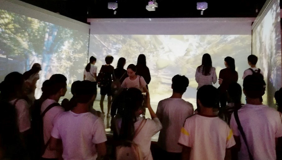 蓝馆中,同学们在工程师讲解与引导下依次参观并体验了3D打印、全息投影、智能语音VR全景单车。同学们纷纷登上沉浸式舞台欢声笑语中体验步步生花、丛林穿越、海底世界等诸多场景17级教技二班的周金利感叹道:“如果虚拟现实和全息投影应用于教学我们的学习内容会更加生动有趣
