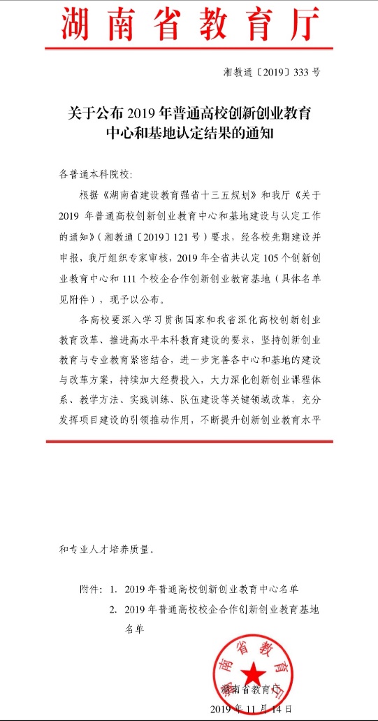近日,湖南省教育厅发布了《关于公布2019年普通高校创新创业教育中心和基地认定结果的通知》(湘教通〔2019〕333号)。公司申报的“‘人工智能+’师范生创新创业教育中心”入选省教育厅2019年普通高校创新创业教育中心建设名单。