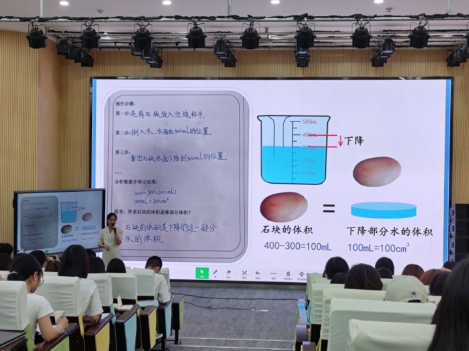 见习活动的第二个环节,主要是针对近年来员工在找工作面试过程中要求提供“教学视频”而设计的,被中小学教师命名为“无生课堂”,即只有教师教学环节的演示,而没有员工的配合,以此展示教师的教学设计和教学基本功。左双老师以《求不规则物体的体积》为课题,展示了一堂生动直观的无生课堂教学,为大家将来的求职就业做了很好的示范。