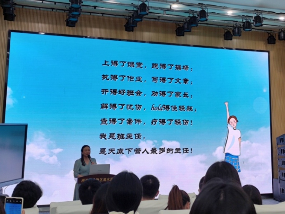 接下来是“湖南省优秀班主任”李佳璘老师为大家做了班主任工作经验分享。她以“你好,小学”为题,指出作为班主任,“我们都是追梦人,作为一名教师,我们应该纯粹一点,有趣一点,努力一点。”她认为教师不是一名教书匠,而应该是有理想、有追求的教育事业专业人才。要成为这样的人,就要抛开杂念、回归初心,就要充满好奇、追逐兴趣,就要努力奋斗、勇闯难关。