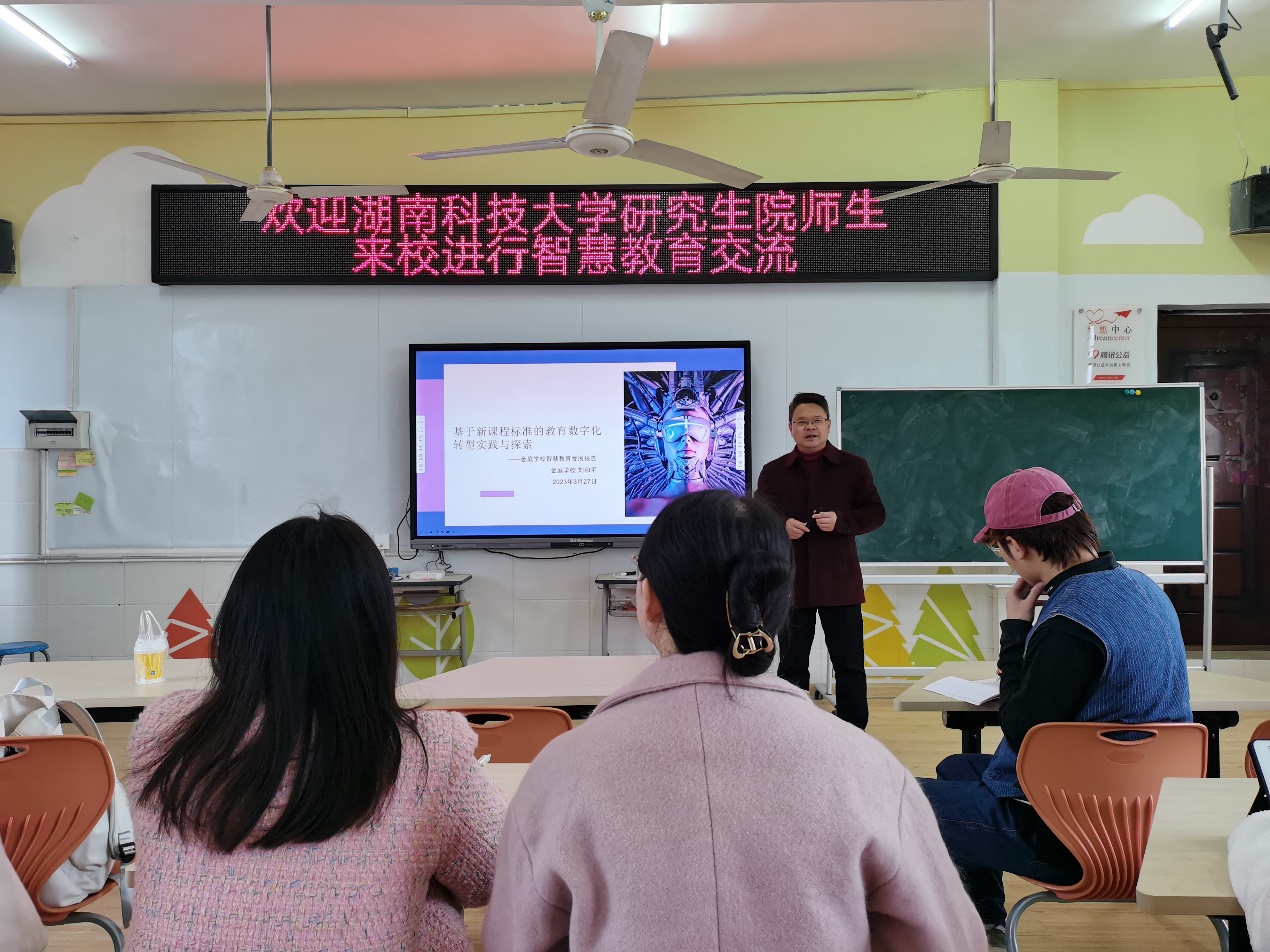 在教育数字化转型的背景下,为助力研究生专业成长,2023年3月30日上午,在永利3044集团官网王伟清教授的带领下,22级现代教育技术、教育技术学、教育管理专业领域的21名硕士研究生深入基础教育一线,来到湘潭市金庭公司,开展以“教育数字化转型交流研讨”为主题的教育见习。金庭公司刘和平董事长高度重视此次智慧教育交流活动,对王教授和同学们的到来表示热烈欢迎。
