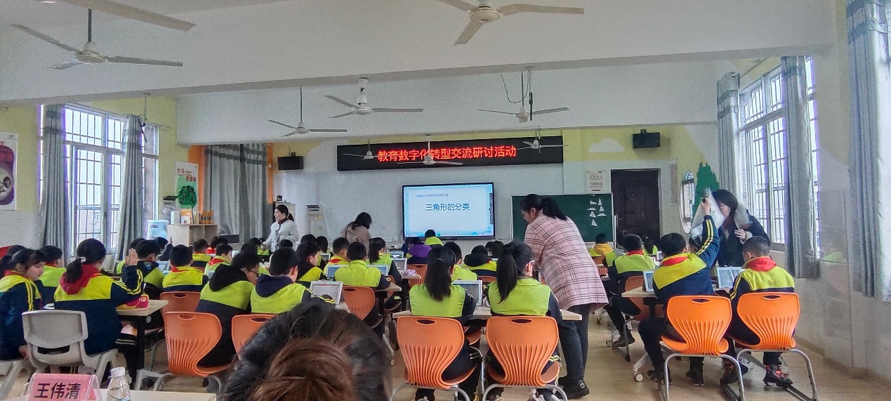 活动议程第二部分,王伟清教授和同学们一起观摩了由金庭公司教师主讲的数学和语文智慧课堂平板教学公开课——《三角形的分类》(郭茜老师)和《红楼春趣》(黄依祎老师)。