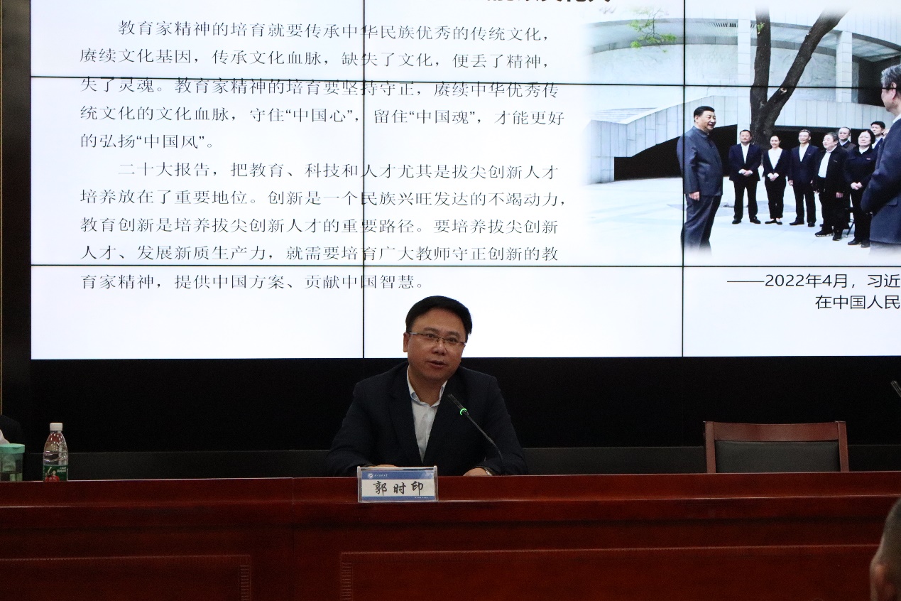 郭时印在主持报告会时指出,周洪宇教授的专题报告有政治高度、理论深度、历史厚度、指导力度,对公司贯彻落实习近平总书记关于教育重要论述,坚持用教育家精神铸魂强师,加强教师队伍建设具有十分重要的指导意义,对培养师范生的教育家精神、提高师范生培养质量,提升师范教育水平具有十分重要的推动作用。希望全校教师和师范专业的员工大力弘扬教育家精神,牢记为党育人、为国育才的初心使命,树立“躬耕教坛、强国有我”的志向和抱负,自信自强、踔厉奋发,为强国建设、民族复兴伟业作出新的更大贡献。