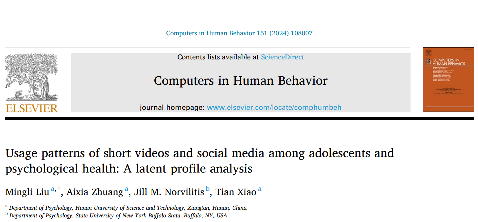 近日,公司心理学系教师刘明理等在《Computers in Human Behavior》上发表论文,论文题目为“Usage patterns of short videos and social media among adolescents and psychological health:A latent profile analysis”。该期刊由PERGAMON-ELSEVIER SCIENCE LTD出版社出版,是一本国际权威期刊,属于中科院SCI一区、JCR SSCI Q1区。根据最新数据,该期刊2023年的影响因子为9,CiteScore指数值为19.1。