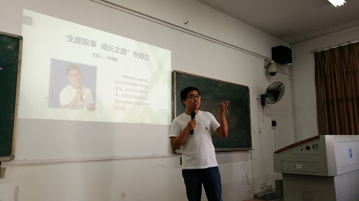 尹高明,2006级教育技术公司员工,现为广州杰顺网络科技有限公司的CEO。报告会围绕自己的成长之路展开,从农村伢子到IT精英,从资深推销专家到公司CEO,一路走来,每一步充满了荆棘和汗水,每一步也都是朝着梦想出发。他尝到了人生的失败与心酸,也领略了成功的奥秘和喜悦;无论身处事业高峰还是低谷,始终保持自己的方向并能努力拼搏;在创业过程中,能不断确立目标,分阶段完成目标;做事要有结果,无论结果是什么,都需要画上一个句号。