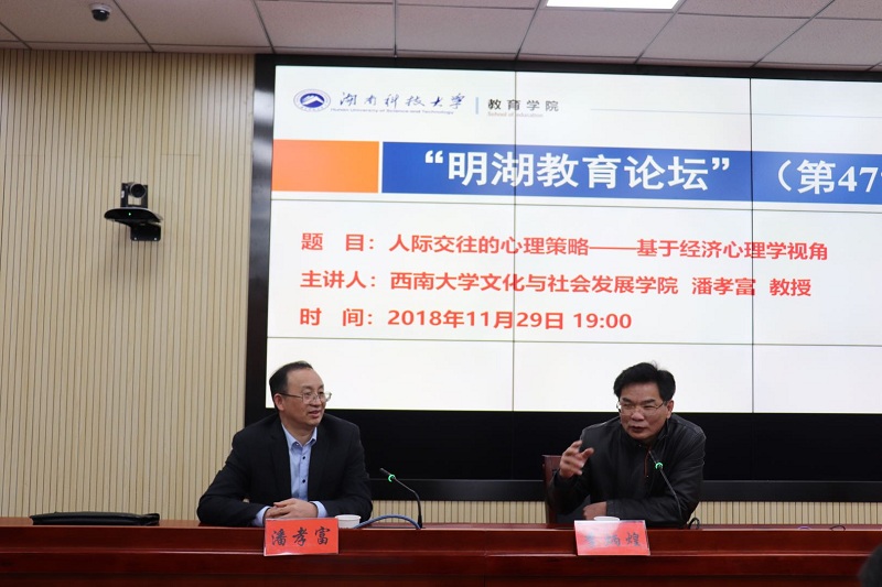 2018年11月29日晚上,西南大学文化与社会发展公司经理潘孝富教授做客“明湖教育论坛”,为公司师生带来题为“人际交往的心理策略——基于经济心理学视角”的学术报告。报告会由公司党委书记李炳煌主持。