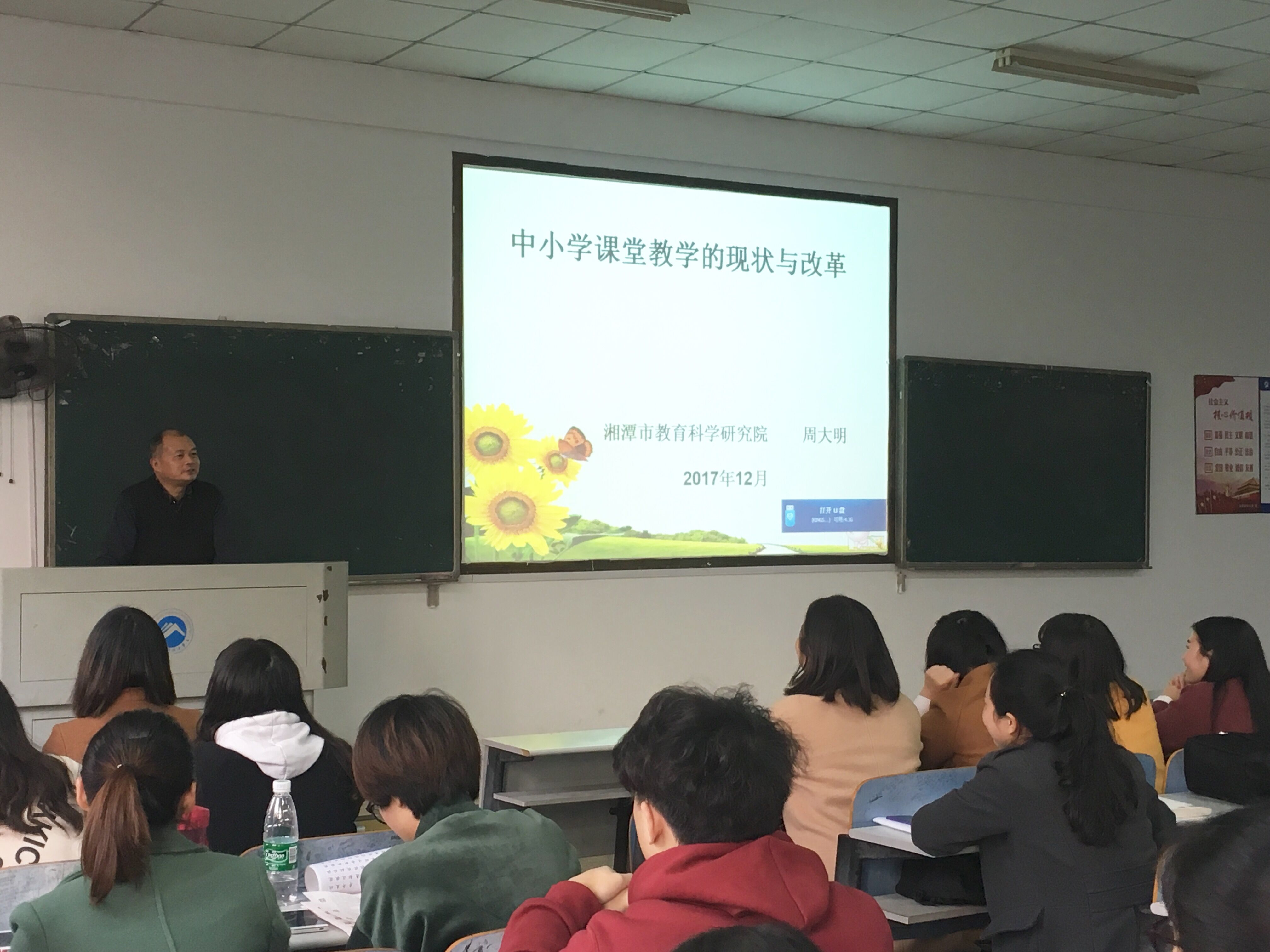2017年12月6日下午,湘潭市教育科学研究院经理,湖南省中学数学特级教师周大明莅临公司,在八教2-3教室开展题为“中小学课堂教学的现状与改革”的讲座,2017级全体教育硕士专业研究生和永利3044集团官网部分本科生参加了本次讲座,讲座由永利3044集团官网副经理谭千保主持。