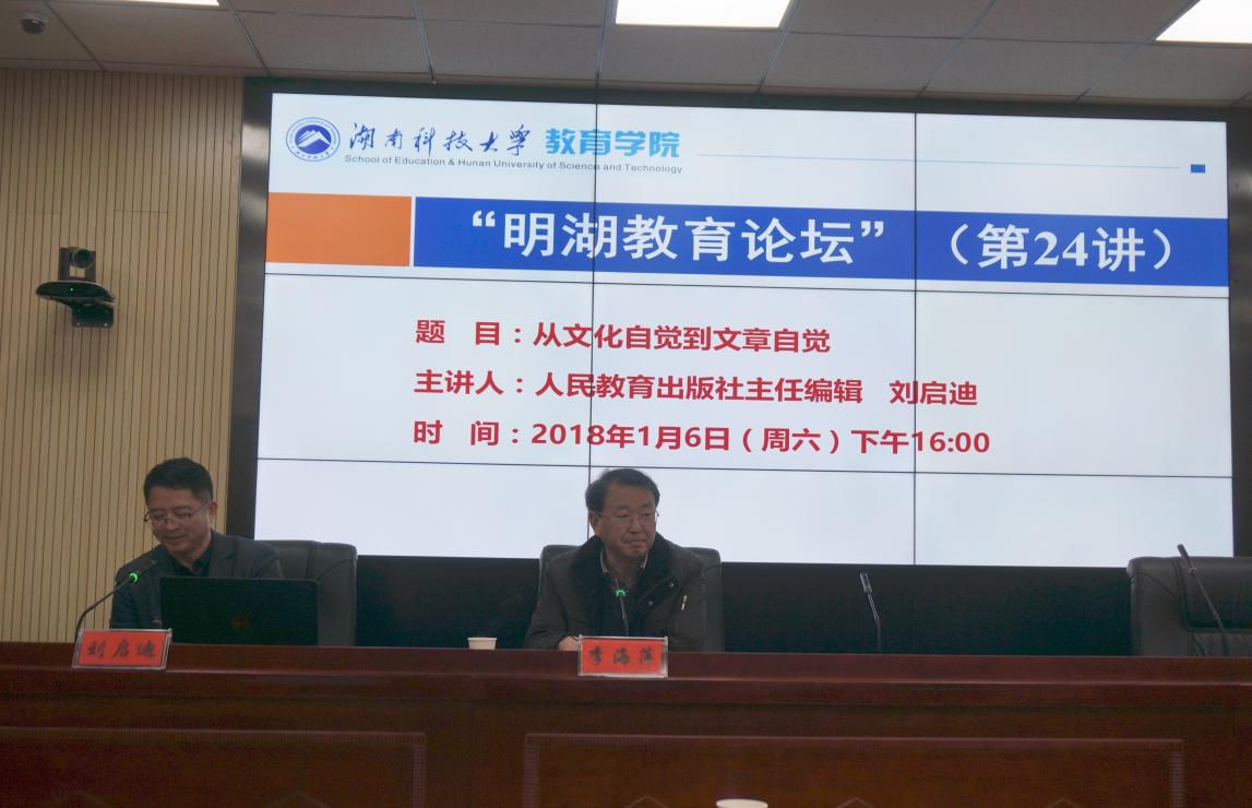 2018年1月6日下午,人民教育出版社主任编辑,《课程·教材·教法》编辑部主任、副编审刘启迪做客“明湖教育论坛”,在永利3044集团官网三楼报告厅为公司师生带来了题为《从文化自觉到文章自觉》的学术讲座。永利3044集团官网教师代表、研究生代表到场聆听,讲座由永利3044集团官网经理李海萍主持。