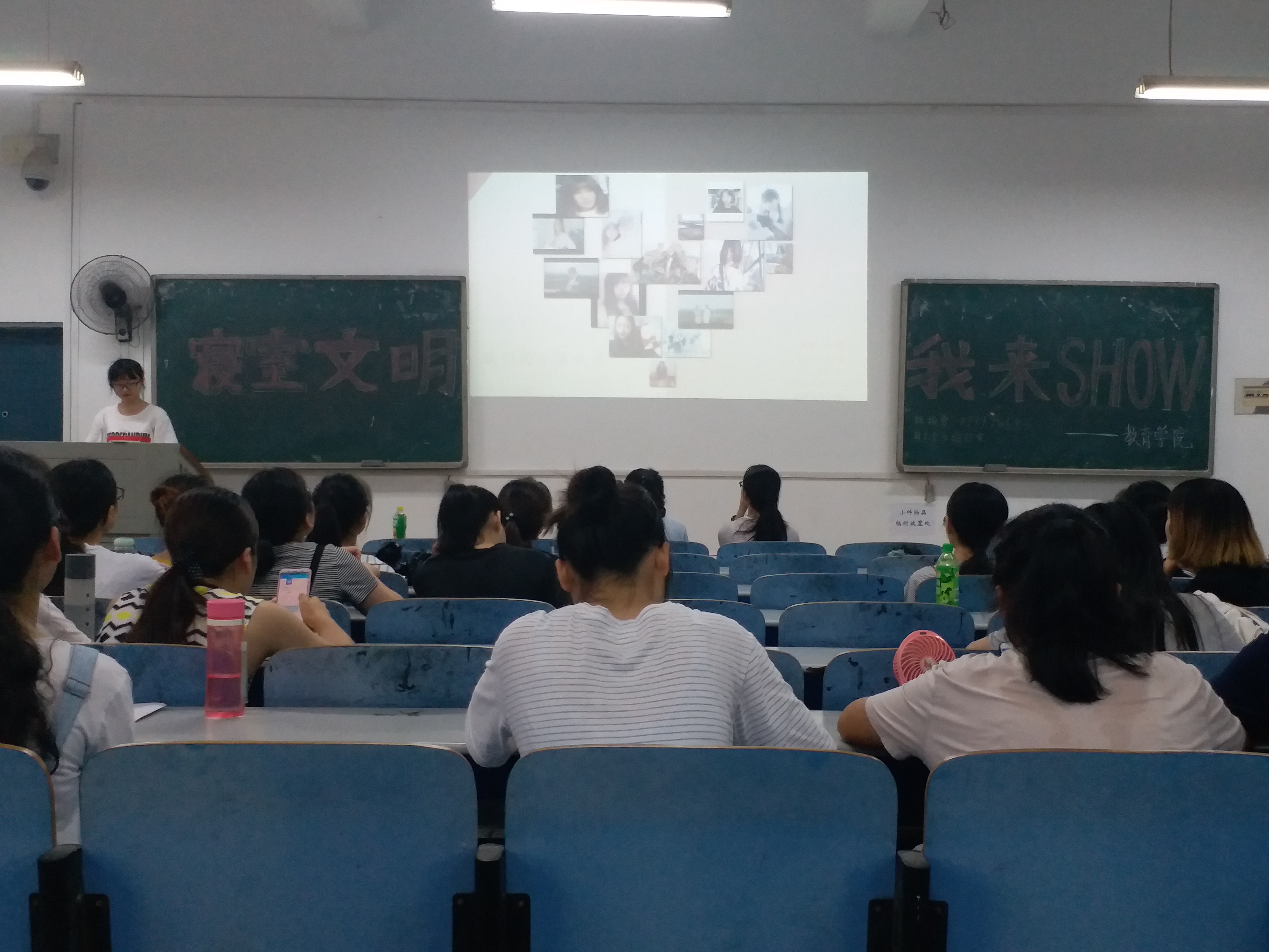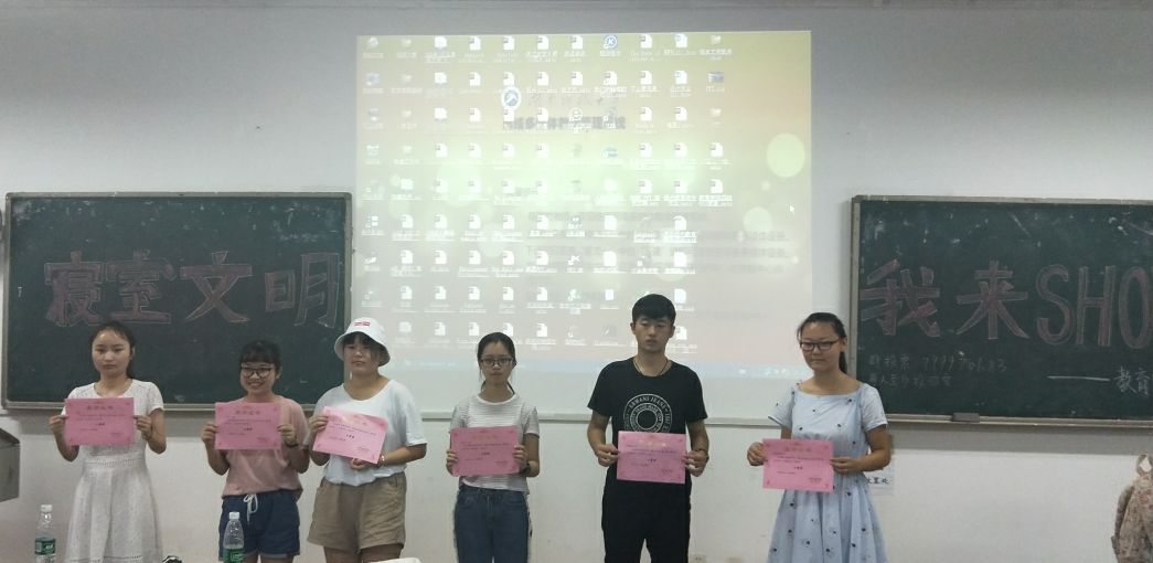 本次活动旨在培育和践行社会主义核心价值观,丰富员工课余生活,建构优质的生活学习环境。各位主讲人通过ppt的展示与解读,向在坐的同学们介绍了本寝室成员的日常活动、学习生活及一些寝室特色标志等;部分寝室因卫生表现良好,成员关系和睦,也多次被评为优秀寝室。在ppt展示过后,现场进行了投票环节,最终17级教育类四班112寝室获得一等奖,17级教育类七班207寝、17级教育类四班603寝室获得二等奖,17级教育类二班404寝室、17级教育类一班403寝室及17级教育类三班601寝室获得三等奖,最后由副主席曾根凤为他们颁奖并合影留念。