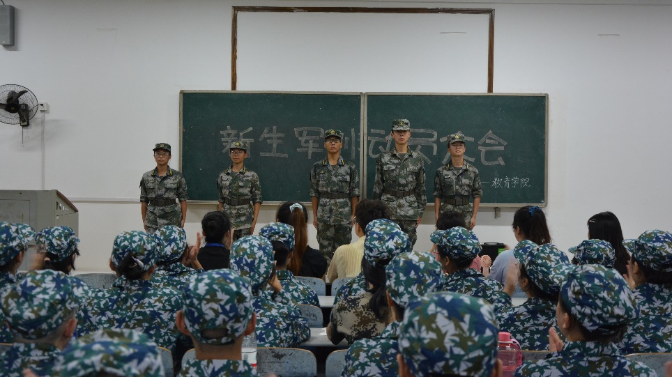 随后,各位教官入场并分别进行自我介绍,教官代表屈江文进行发言。他要求新生把自己当做真正的军人,严格要求自己,继承发展不怕苦、不怕累、艰苦奋斗的精神;他希望同学们每天训练后认真总结,并从中汲取精神力量。同时,他表明教官们会以身作则,以良好的军人形象带领大家,以过硬的军事本领引导大家。