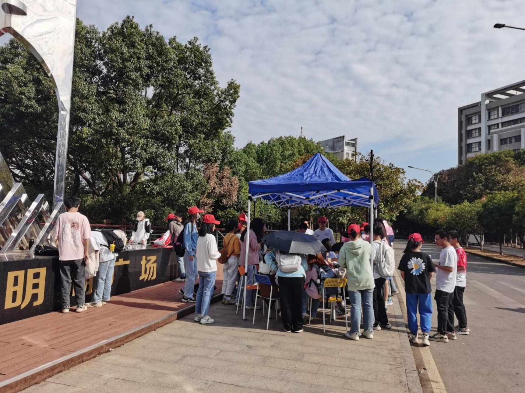 志愿者们积极的给经过的同学们分发活动传单并介绍此次活动,同学们也热情参与其中,在志愿者帮助下进行明信片创作。随着活动火热开展,同学们参与热情上涨,不久便坐满了一桌进行明信片绘制,更有热情参与的同学们围在明湖广场的台面上进行绘制,即便骄阳似火也抵挡不住同学们积极参与的热情。