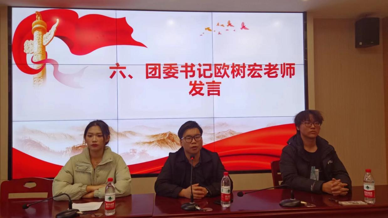 会上,欧树宏表示作为团员应该始终牢记自己的入团初心,时刻思考自己在团组织中所发挥的作用,并对在座团员寄予希望,殷切期盼各位团员提前规划自己的人生目标,无论是在生活上,还是学习上,都要成为青年之中的领头羊,成为榜样。并且强调团员应该经得起考验,才能在以后的生活和工作中能够为自己创造出一片属于自己的天地。他祝愿每名共青团员在今后的学习与生活中,都能取得不错的成绩,为自己赢得光明未来,并带领各位新老团员齐唱团歌。