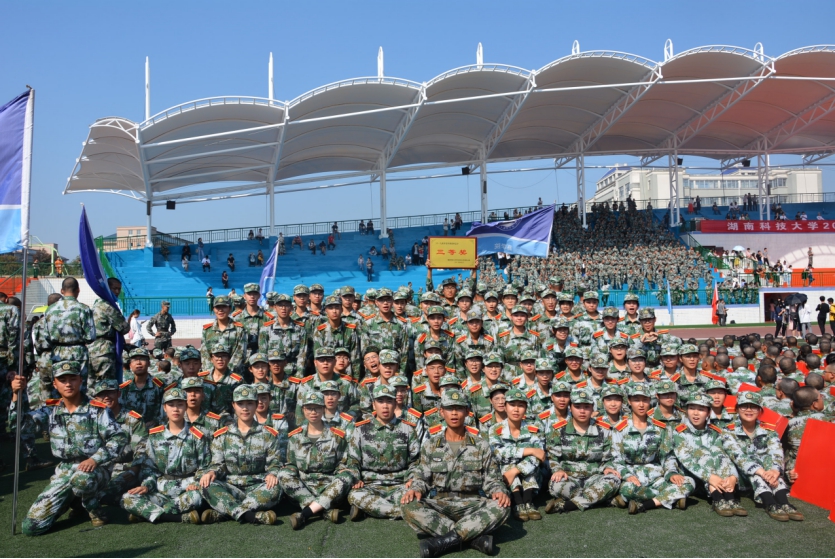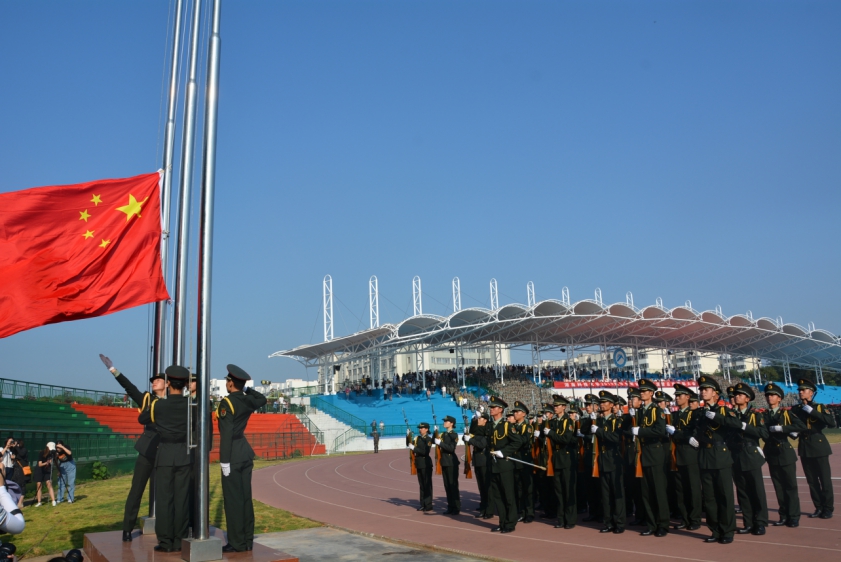 伴随着国歌声响起,五星红旗在风中飘扬,庆国庆、迎校庆,在场新生高声齐呼“祝祖国繁荣昌盛,祝科大越来越好!”紧接着,开始进行军训汇报表演,由军训团教官方阵队打头阵,来自各个公司的方阵队迈着整齐的步伐走向主席台。“名为希望,身似尖钢。看我教院,横扫八荒!”,伴随着响亮的口号声,来自公司方阵队昂首挺胸,步伐坚定,展现出教院学子的恢弘气势。在接下来的拳术表演和战术表演中,身着军装的同学们英姿飒爽,气势如虹,令人叫好连连。