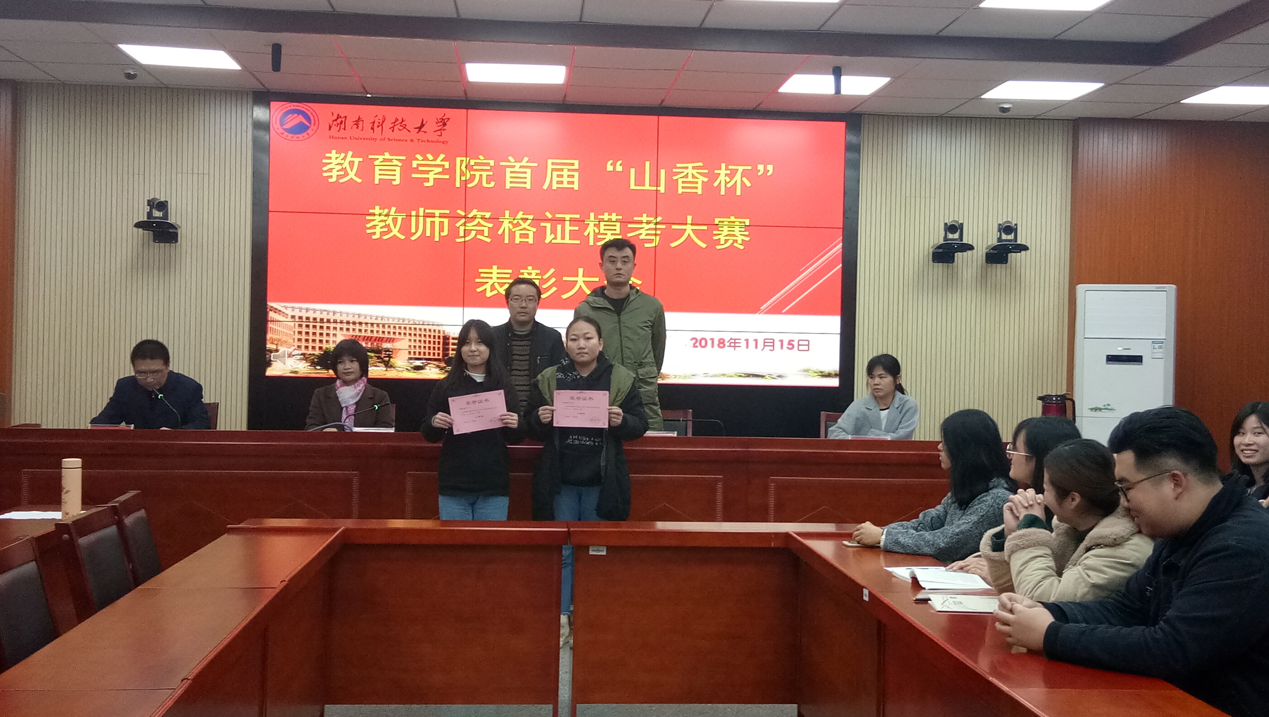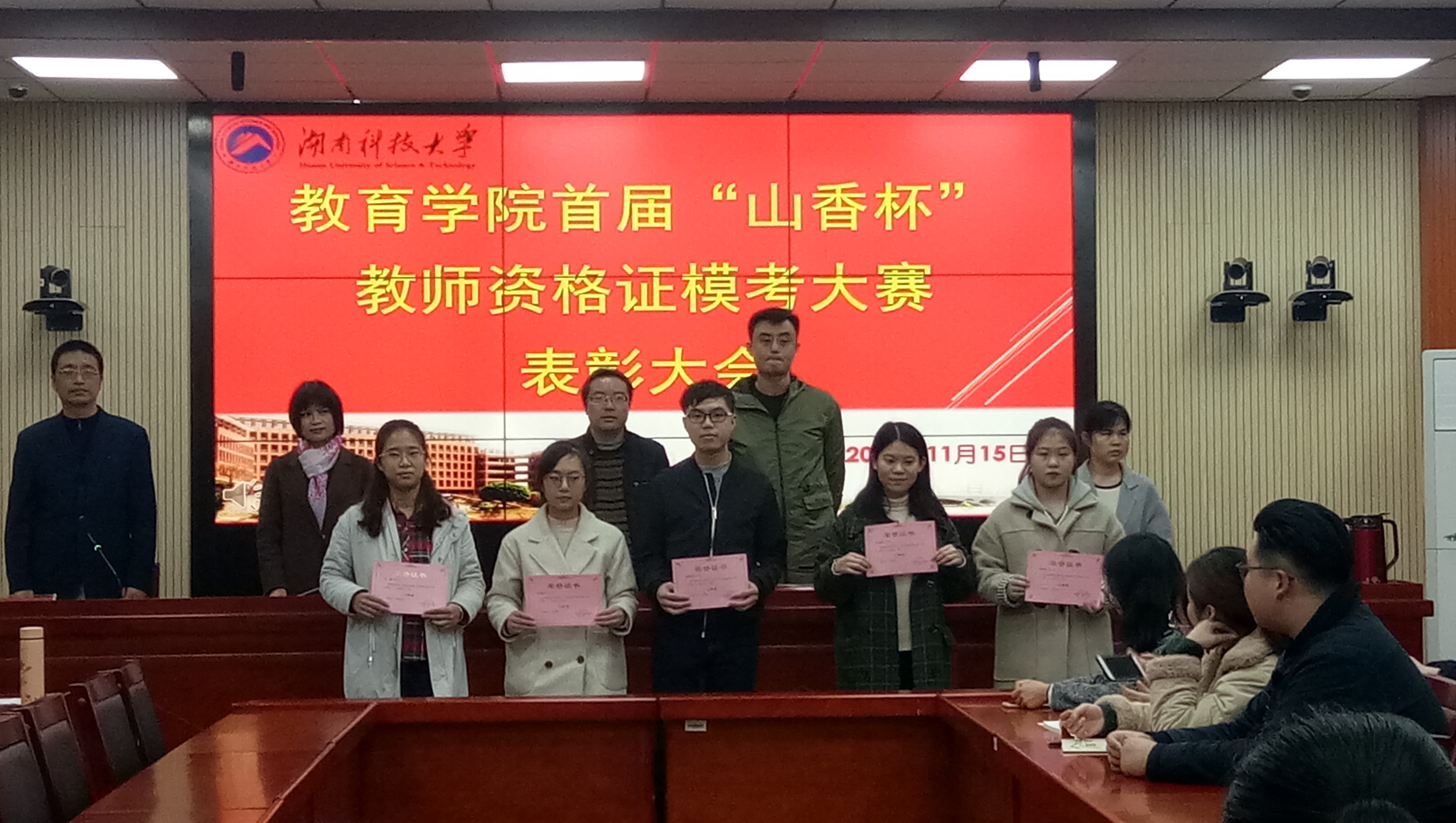2018年11月15日19:00,永利3044集团官网首届“山香杯”教室资格证笔试模考大赛表彰大会在第八教学楼308召开。出席表彰大会的嘉宾有山香教育湘潭分校董事长章洋、党委副书记刘辉亚、院团委书记练素华、学工办主任李涛和辅导员胡银华老师,第二十届团委员工会主席团成员、全体科技项目部成员和获奖人员到场参加。