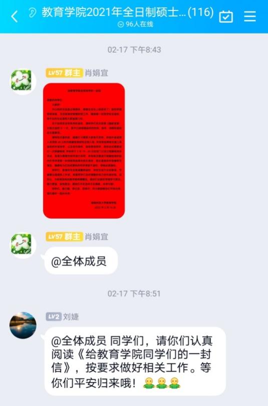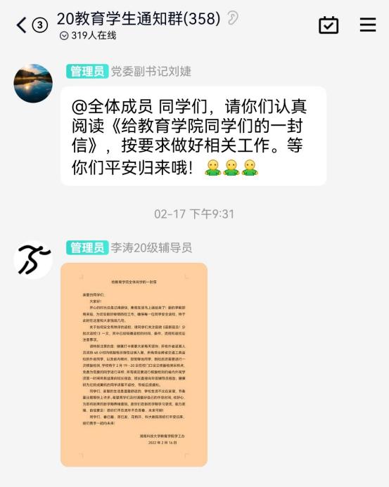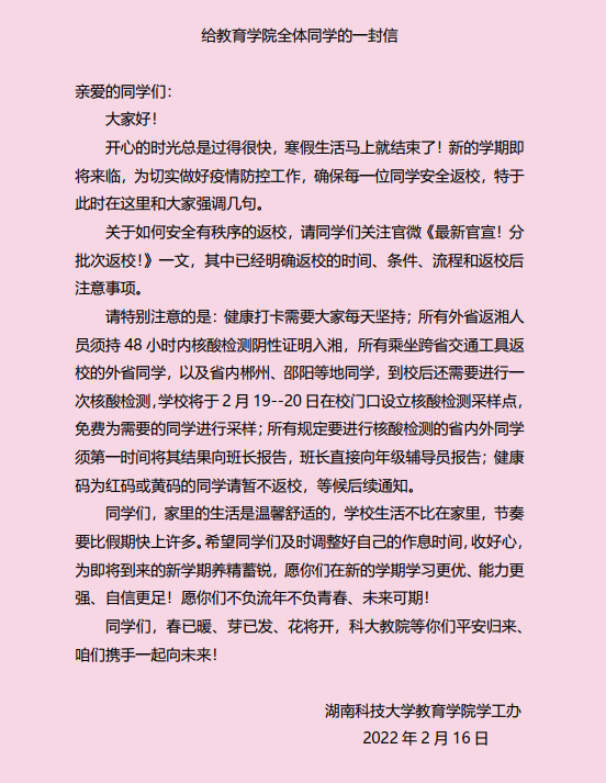 本次新学期返校宣传和动员工作采用书信这一新颖和独特的方式,引起了同学们的热议。“公司的这封信让我感到十分惊喜,可以从字里行间感受到老师对我们的关心,满满的安全感让我对新学期的生活充满了期待。”读完信后,21级应用心理学专业三班吴涵同学感慨到。“在疫情期间,能如期回到校园继续进行研究学习,我知道这背后是无数人疫情防控的艰辛付出,公司的这封信更是让我们感到眼前一亮,非常暖心。草木蔓发,春山可望,听说最近公司的梅花、桃花都开了,我得趁着春光,去看看。”20级教育学专业研究生刘佳慧同学说到。