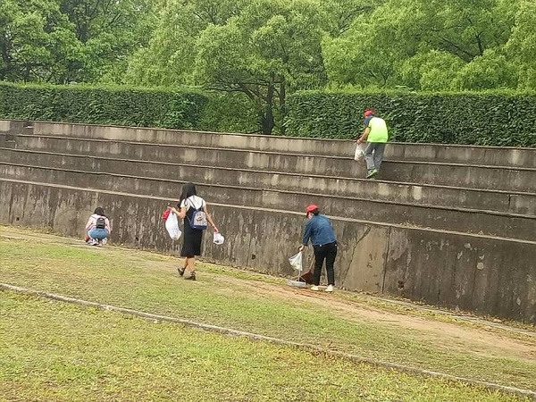 大概一个小时过去了,大家总算清理干净田径场及周围的石梯,于是将一袋又一袋满满的垃圾提去进口处放好。这时,环望四周一眼,大家的脸上露出了微笑,然后开始清理周围绿化带的垃圾。依旧以之前的小组进行清理,每个人仍然很认真,草丛中有不少的白色垃圾,有的是才扔的,有的明显看出是已经在那很久的垃圾,志愿者们全部将它清理出来,还绿化带该有的美丽!又是半个小时过去,队员们终于把里面的垃圾清理完,最后带着微笑一起将垃圾放入周围的垃圾桶!