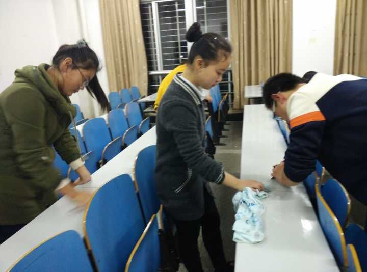 清除桌面涂鸦,创造良好课堂环境。2015年11月14日星期六晚,永利3044集团官网青年志愿团在第八教学楼开展清理教室志愿活动。