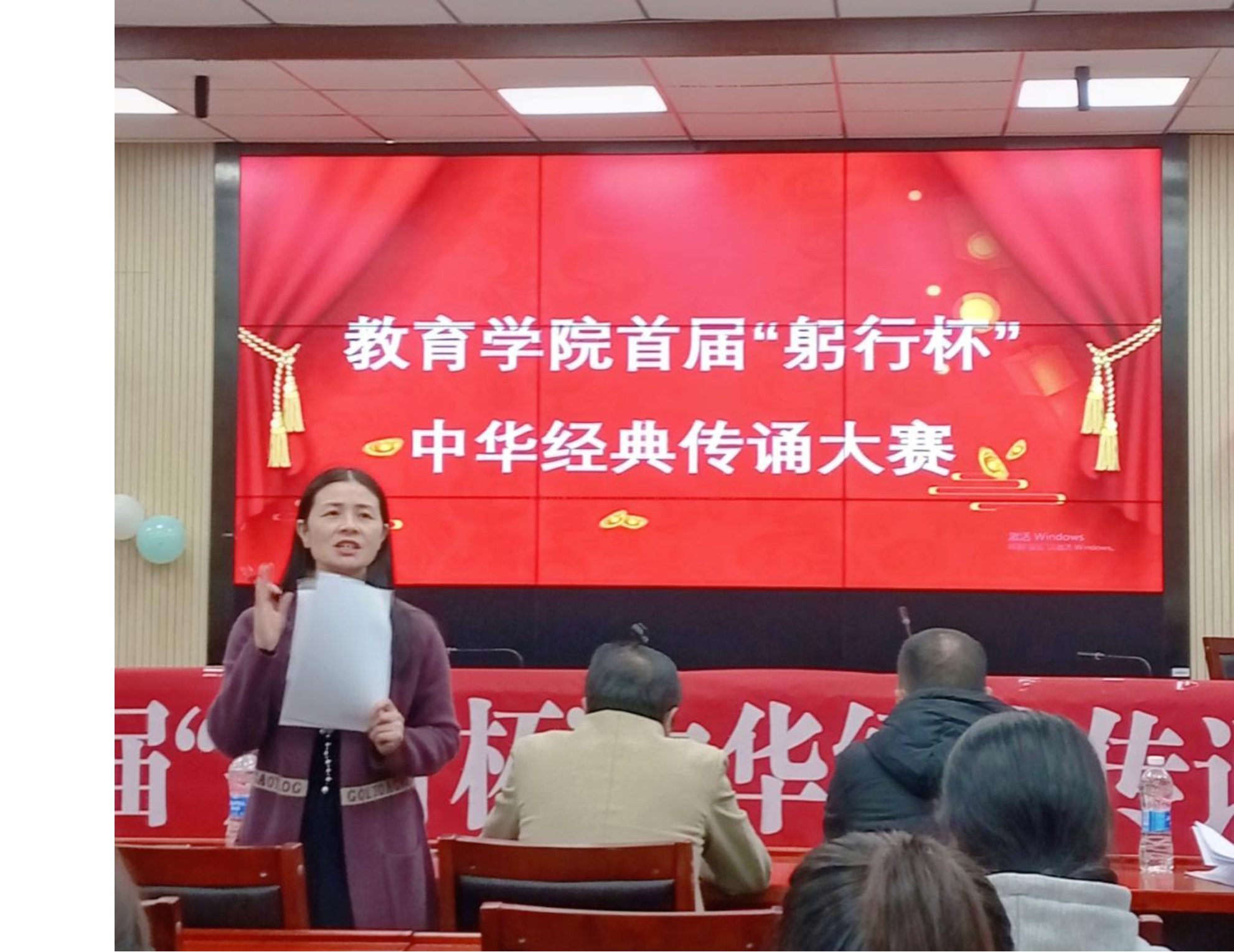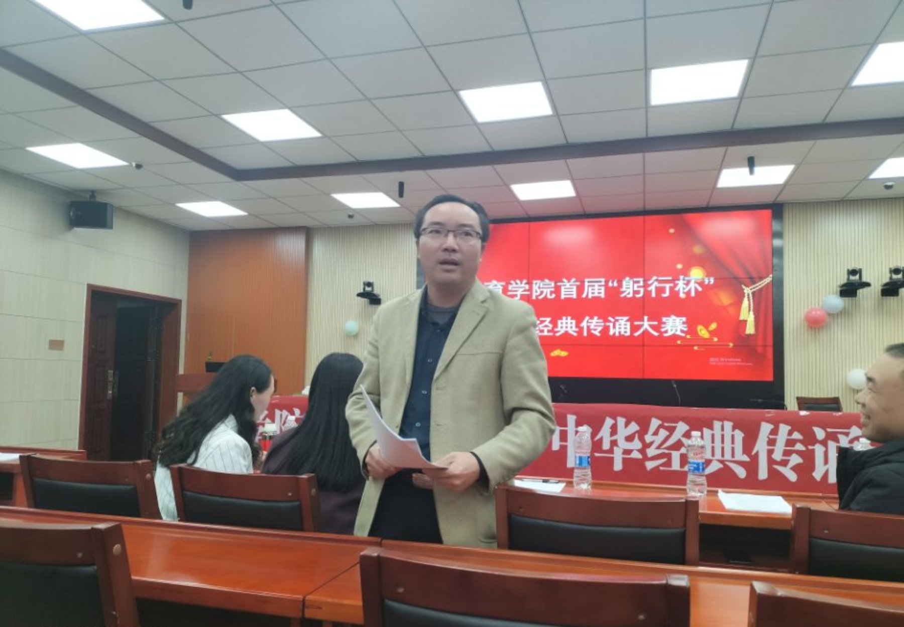 为进一步丰富校园文化生活,营造浓厚的书香校园氛围,弘扬中华优秀文化,激发员工的读书和诵读经典热情,更好地促进公司员工人文素养培养,永利3044集团官网举行了首届“躬行杯”中华经典传诵大赛。本次大赛由小学教育系和院团委联合举办,由黄青老师担任总指导,由科技活动部进行策划组织,经过初赛选拔,共有13个小组入围决赛环节。决赛于10月22日晚在第八教学楼308室进行,公司刘辉亚副书记、小教系夏永庚主任、冯青来老师、黄青老师以及特别邀请的教务处夏莉副处长出席担任评委。