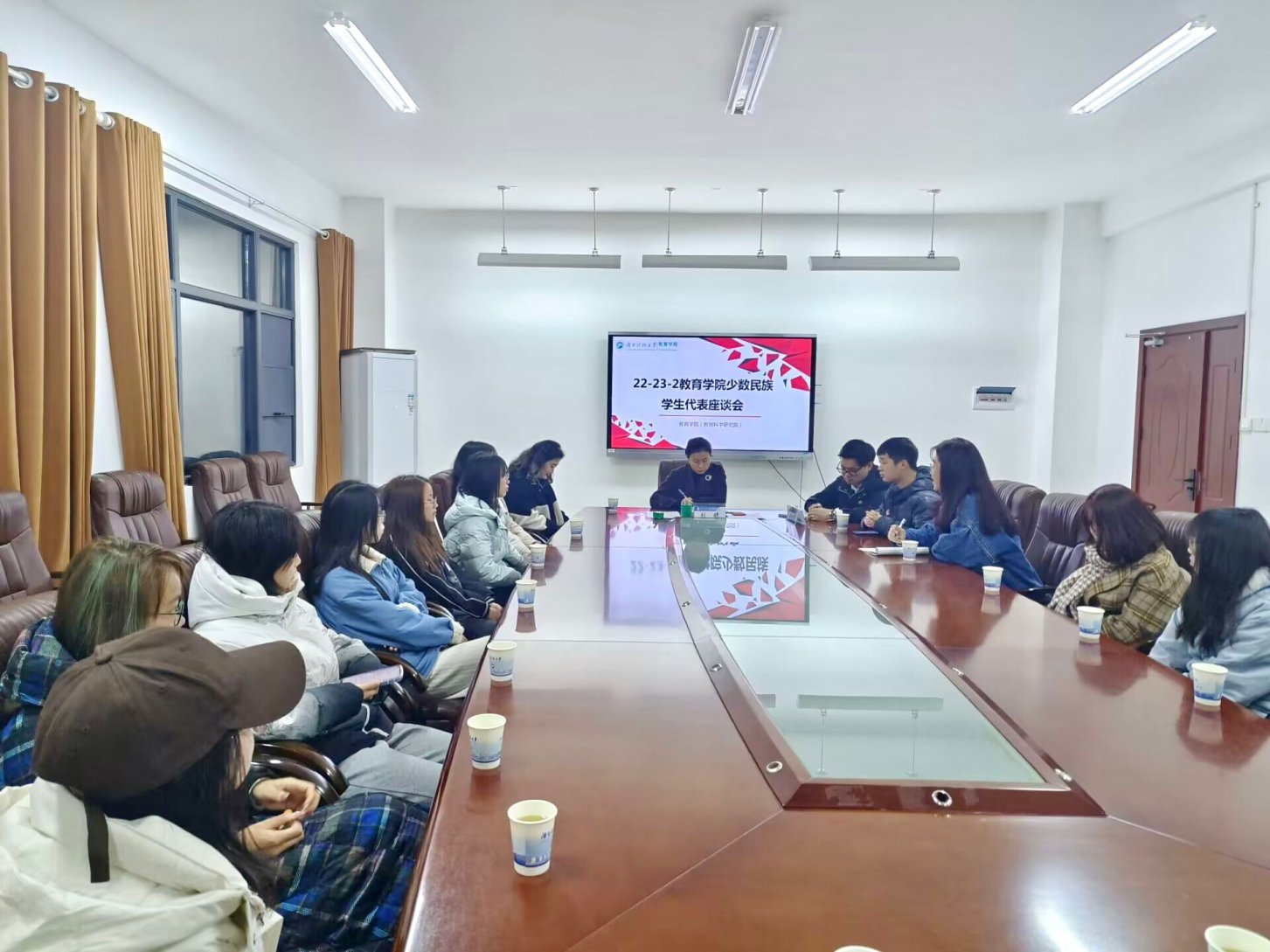 会议伊始,欧树宏让大家简单介绍自己民族的习俗。土家族员工代表讲述了自己民族的哭嫁习俗,彝族员工代表讲述了火把节和抬菜舞,还有白族的围炉谈年等等。同学们畅所欲言,感受着不同的民族风情和民族特色,整个座谈会气氛和谐,欢笑声此起彼伏。