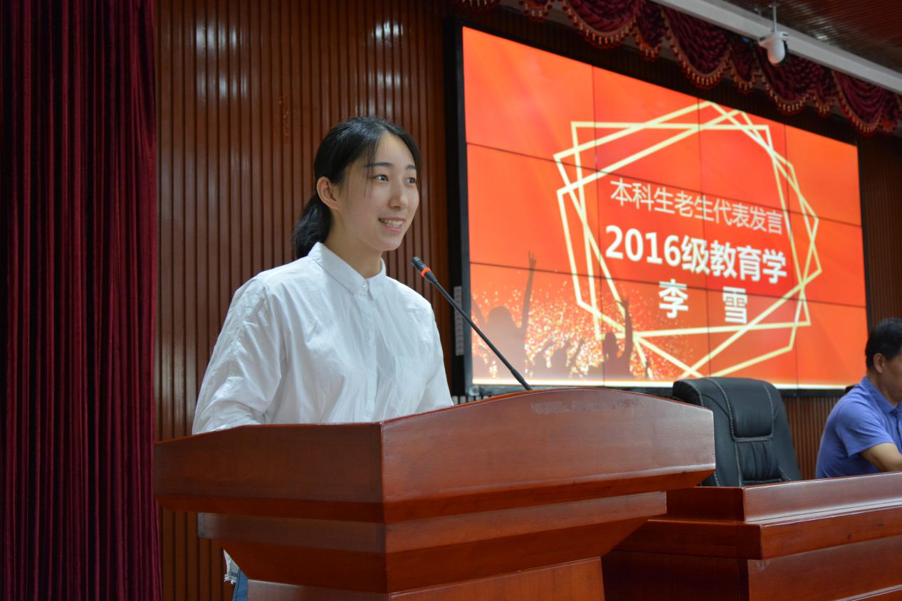 16级在校本科生代表李雪以自身为例子讲述大学学习生活,她提出了几条“别做什么”的建议——别害怕,保留魄力与勇气;别期待轰轰烈烈,简简单单才是最好的安排;别让自己习惯静止。她期待新生们能够在未来的四年里不负过往、拼搏现在、成就未来,为教院的未来添砖加瓦。