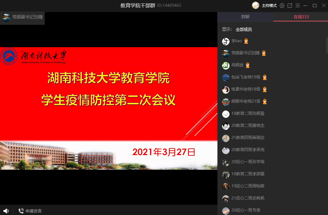 为进一步强调疫情形势以及防疫工作的重要性,提高公司全体员工防疫意识。3月27日晚上19:00,永利3044集团官网员工疫情防控第二次会议暨第二次全体员工干部级党员大会在线上顺利召开。公司党委副书记刘婕,学工办主任李涛,辅导员练素华、胡银华、肖娟宜,学工办助理包尚飞出席本次会议。永利3044集团官网团委员工会、研究生会全体员工干部、员工党员、各年级长、班长、团支书以及寝室长参加。会议由李涛主持。