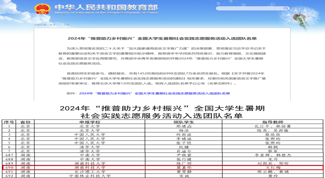 7月2日,教育部官方网站公布了《2024年“推普助力乡村振兴”全国老员工暑期社会实践志愿服务活动入选团队名单》,共有1452所高校的6998支团队7万余名师生报名,经主办单位遴选,共有1200支团队入选。永利3044集团官网“木槿感恩支教团”推普实践队成功入选2024年“推普助力乡村振兴”全国老员工暑期社会实践志愿服务团队。