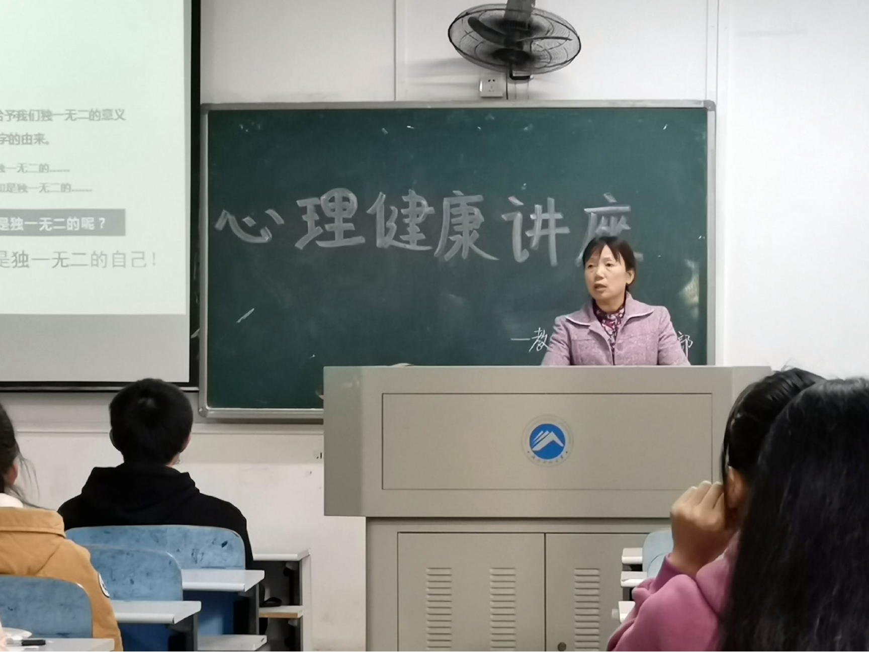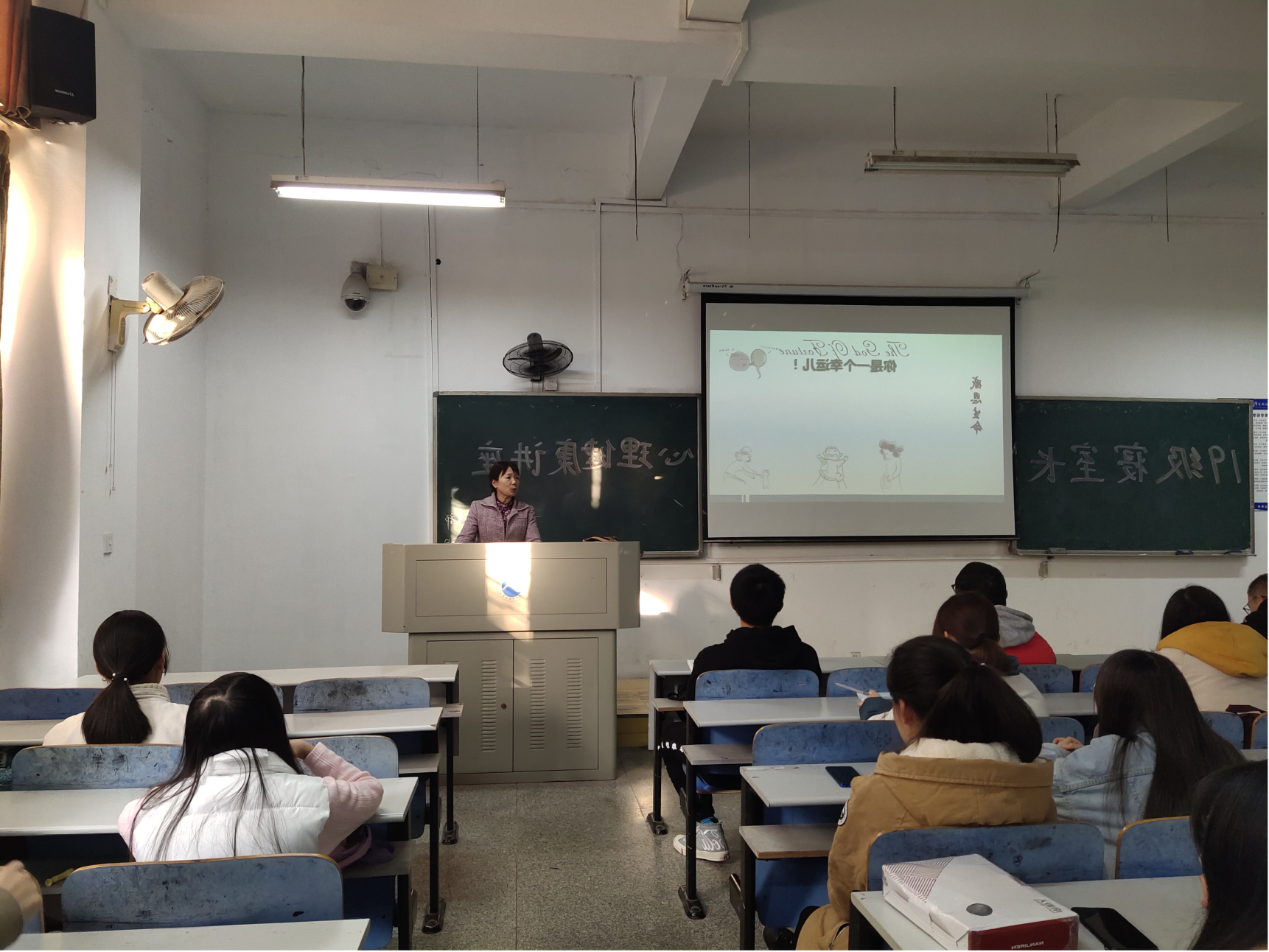 之后尹老师举例强调了坚强、积极、乐观等品质对生命的重要性,呼吁同学们欣赏生命。接着在人际关系、经济状况、学业等方面强调如何保护生命以及抑郁症做了相关知识的普及。