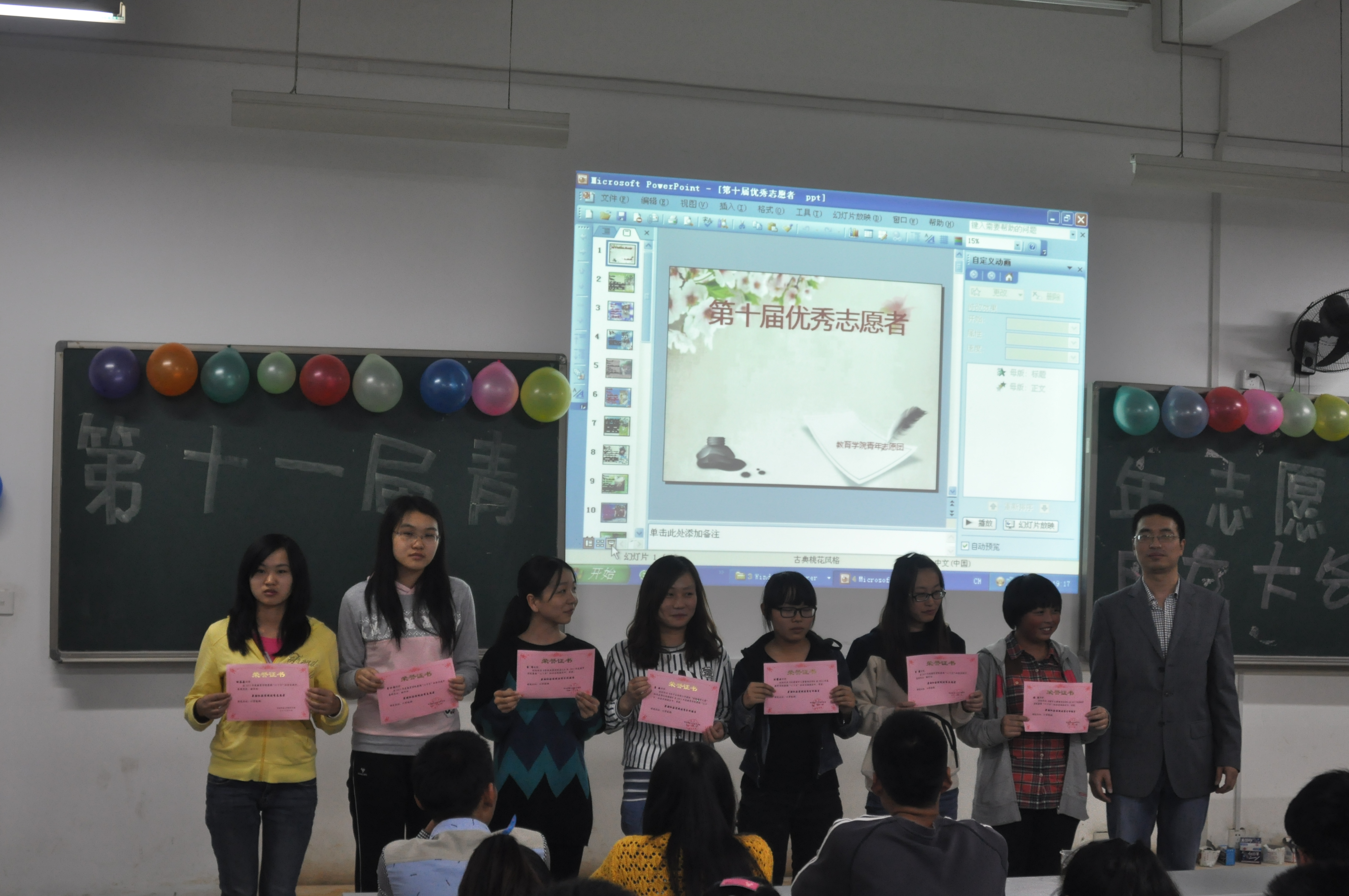 第十届青年志愿团,人人奉行当初的誓言,“尽其所能,不计报酬,无私奉献”。自然会涌现出一批表现优异者,如将昭香、袁星芳等15个优秀志愿者,李方舟、吴均妍等5个暑假社会实践优秀志愿者。唐敏的《关于云南省丽江市监狱“法制留守儿童的存在情况的调查》、袁清的《寻找角落里的老人》等5个人的实践分析报告也获得一致好评,在大会上,李涛老师也一一为他们颁发奖项。
