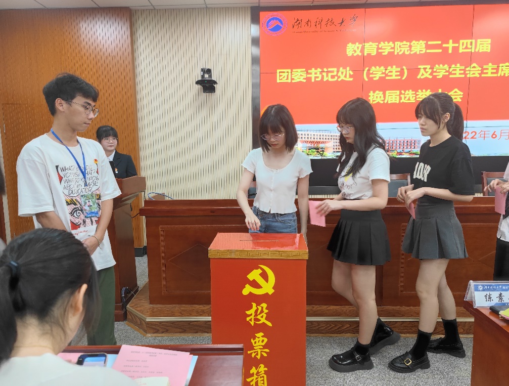 八位候选人演讲完毕后,由主持人宣读监票人、唱票人、计票人名单,进入投票环节。为保证竞选结果公平,工作人员组织非工作人员有序离场,员工代表填写并排队依次投入选票。计票完毕,由罗江林宣读投票结果,曾雪、王泽钦、王天硕、黄雅婷、江梦婷、孙学瑶、刘阎姣七位同学成功入选第二十四届团委书记处(员工)及员工会主席团。接着,胡银华宣读第二十三届团委书记处(员工)及员工会主席团成员名单,刘婕为其颁发聘书。