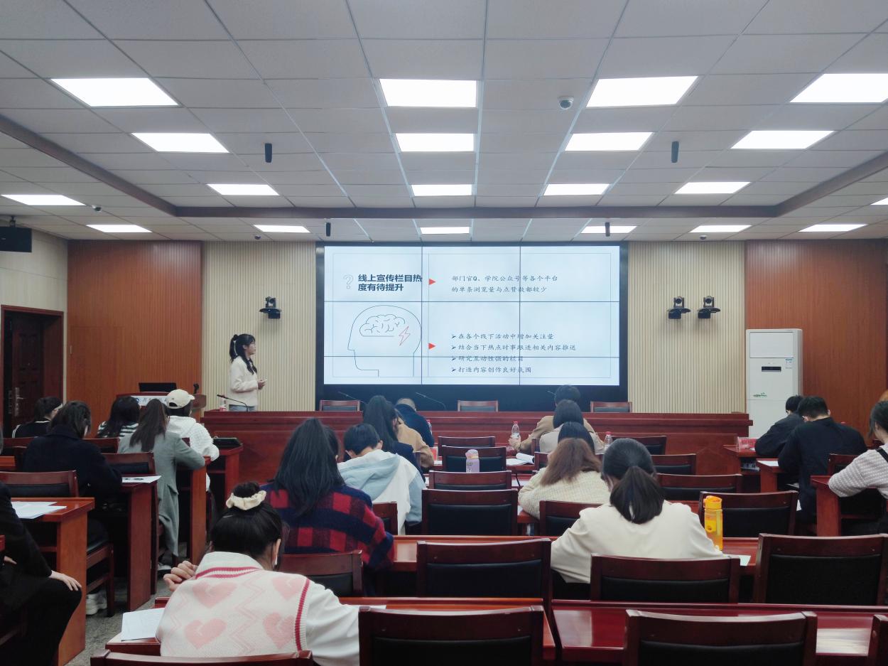 2021-2022学年第二十三届团委、员工会员工干部述职评议会议于3月30日晚上19:00在第八教学楼308会议室顺利召开。公司党委副书记刘婕、学工办主任李涛、团委书记练素华、21级辅导员胡银华、兼职辅导员包尚飞出席会议,院团委员工会主席团成员以及各部门部长及直属机构负责人参与述职,会议由员工会执行主席杨淑雯主持。