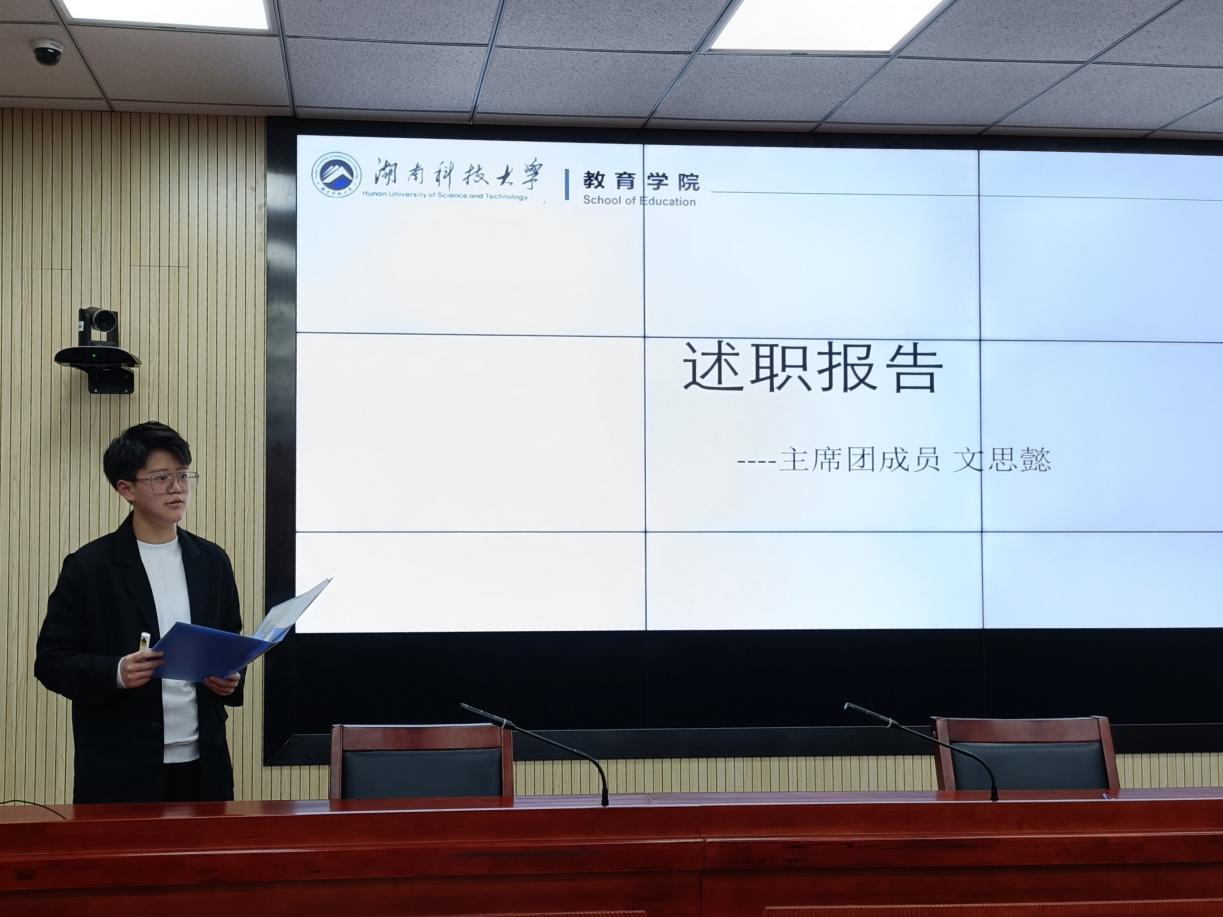 会议伊始,杨淑雯对到场来宾作出简要介绍后宣布述职评议会议正式开始。四名团委员工副书记和两名主席团成员依次述职。团委员工第一副书记田玺如从工作重点、工作亮点、不足之处及个人述职四个方面进行汇报。在任职期间,她一直秉持“赤诚服务”的工作态度,努力做好每一件工作。随后,团委员工第二副书记孟赵阳结合十个月的任职经历,表达了自己在前段工作中的所思所想。紧接着,主席团成员文思懿也就军训工作、青春夜跑等活动作出总结,并提出个人反思,阐述其改进之处。