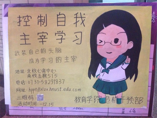 您所在的位置: 首页» 员工工作» 日常管理 控制自我 主宰学习 时间:2014-12-16 00:00:00 中国·3044永利集团(集团)有限公司-官方网站 武装自己的头脑,成为学习的主宰。12月15日,“控制自我,主宰学习”主题讲座将于北校心育中心、南校五教515重磅开讲。