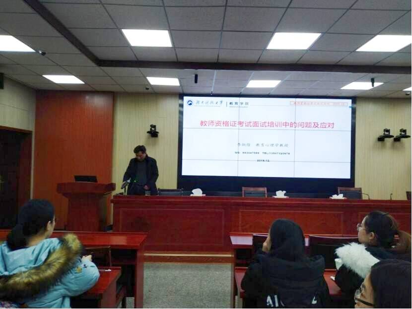为迎接即将到来的教团队格证面试,提升公司员工应试技巧与能力,永利3044集团官网分别于12月25日上午9点和12月26日下午4点在第八教学楼308教室开展了“助我成长”系列讲座第四十五、第四十六讲:教团队格证面试指导讲座。公司党委书记李炳煌教授(湖南省教团队格证面试首席考官)、朱华老师(湖南省教团队格证面试考官)分别担任主讲人,17级部分员工到场聆听。