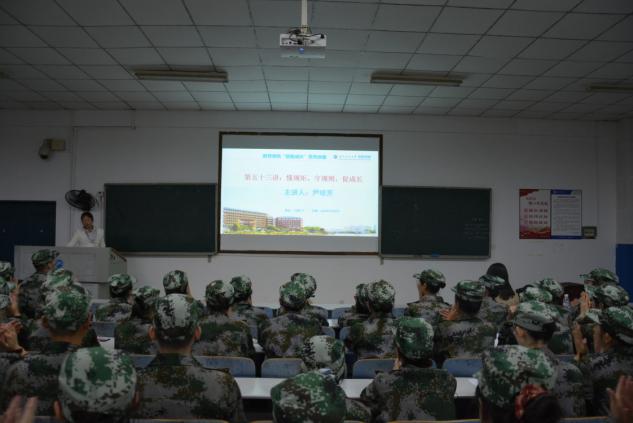 讲座伊始,尹琼芳从新生高中时期最常听到的那句“到了大学你想怎么玩就怎么玩”为切入点,指出其中的逻辑错误,并告诉新生,大学是人生的一个新的起点,大学应该比高中更加充实、更加努力。随后,她通过对比中学和大学管理模式的不同,着重强调了自律和他律的重要性。围绕“没有他律,难以成长成材”,尹琼芳从管理方法、管理内容、日常管理制度三方面为大家全面解读了公司的管理机制基本要求,重点介绍了课堂考勤、晚自习、晨跑、晨读、卫生、晚归的检查流程和违纪处理方法等,使新生在愉悦轻松的氛围中对公司的管理规章制度有了进一步的了解。为更好配合公司管理工作的进行,她对新生提出几点要求:培养自律能力,把学习当作主要任务;主动沟通,有事提前沟通;突发和特殊情况,事前给老师短信请假,事后及时补纸质假条。最后,尹琼芳勉励新生多一些自律,少一些自由;多一些规矩,少一些任性;多追求知识,少寻求娱乐。讲座在新生的掌声中落下帷幕。