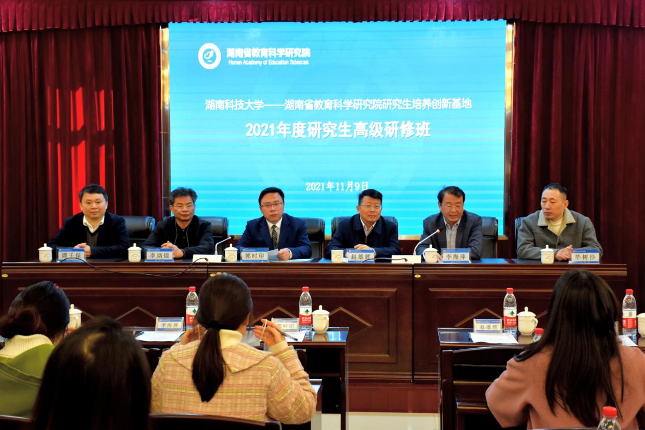 11月9日,湖南省教育学公司产品创新基地2021年度研究生高级研修班在湖南省教育科学研究院博士后工作站五楼会议室举行,湖南省教育科学研究院副经理赵雄辉、科研处处长毕树沙,公司纪委书记郭时印、研究生院经理李海萍,公司党委书记李炳煌、副经理谭千保、研究生办主任林艳阳等出席开班典礼,2020级教育学一级学科硕士研究生参加了本次研修。开班典礼由公司研究生院经理李海萍主持。