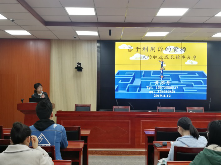 2019年4月12日上午10点,永利3044集团官网优秀员工2006级应用心理学专业本科生、2016级硕士研究生、国家二级心理咨询师、郴州市第一人民医院心理科心理咨询师黄苏丹回到母校,在第八教学楼308为公司师生带来“助我成长”系列讲座第二十四讲:生涯叙事· 成长之路(六)——“善用资源 助力职业发展”。永利3044集团官网教师代表、员工代表到场聆听。讲座由公司党委副书记刘辉亚主持。