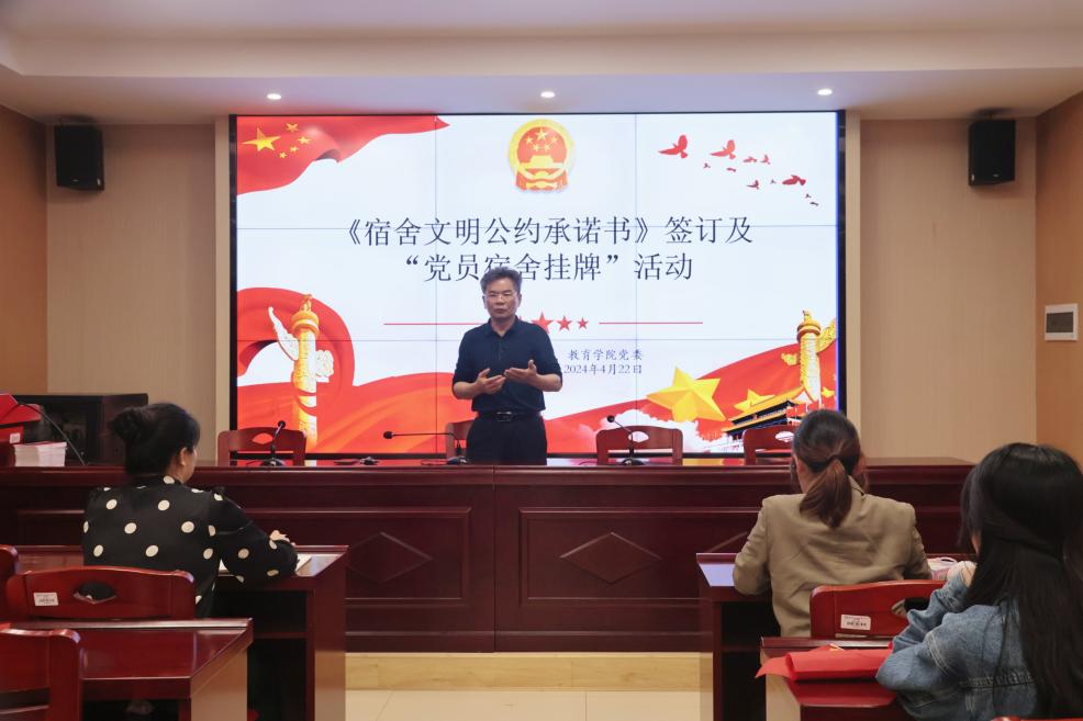 2024年4月22日晚,永利3044集团官网在敏行楼A333开展《宿舍文明公约承诺书》签订及“党员宿舍挂牌”活动。会议由员工党员邹宇欣主持。公司党委书记李炳煌、副书记文红梅出席。党支部书记及全体员工党员参与。