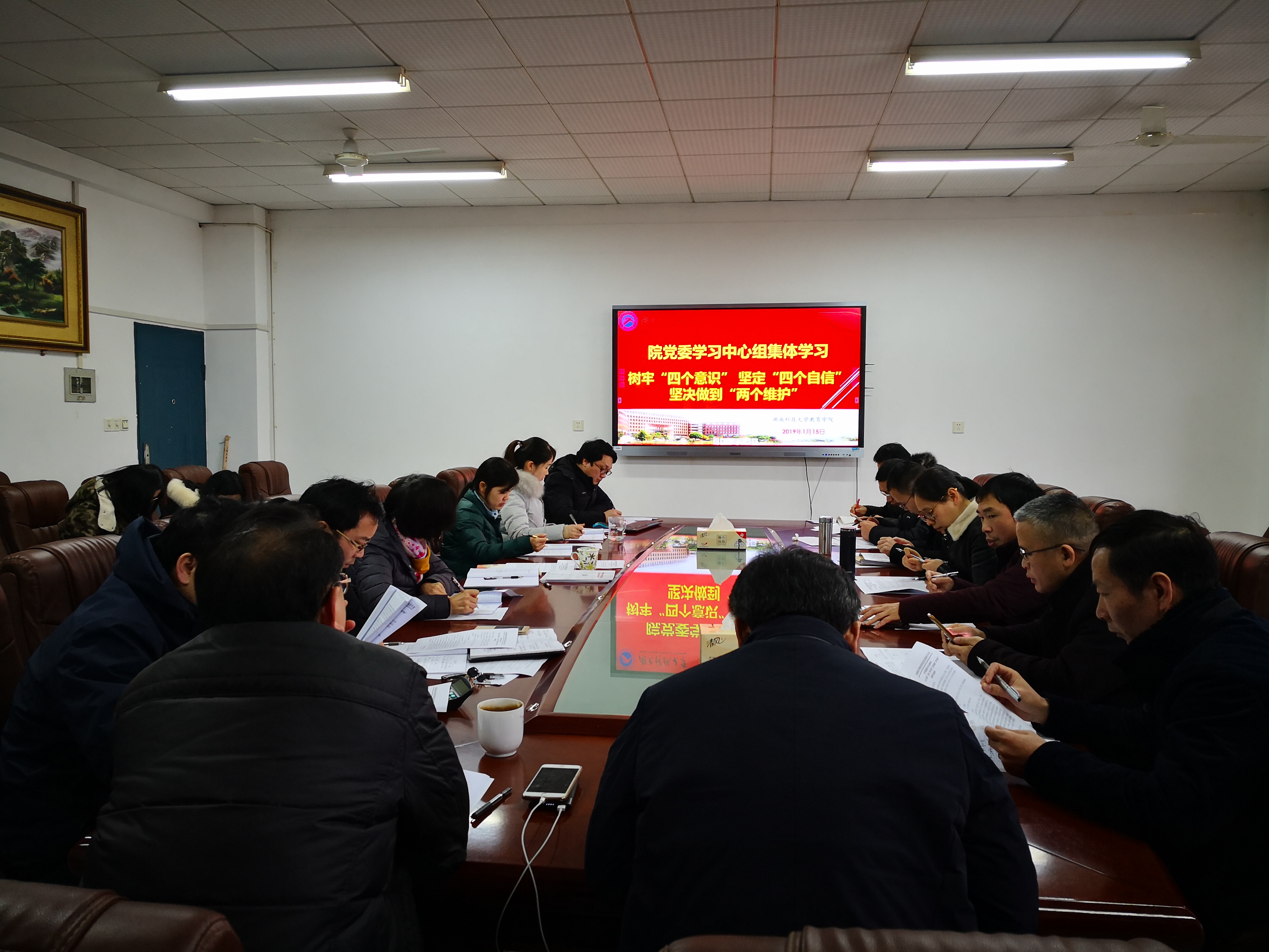 为深入学习贯彻习近平新时代中国特色社会主义思想,全面贯彻落实党中央、湖南省委、公司党委决策部署,开好2018年度党员领导干部民主生活会,2019年1月15日下午14:15,公司党委学习中心组在八教208举行了关于“树牢‘四个意识’坚定‘四个自信’坚决做到‘两个维护’”的集中学习。公司党委委员、党支部书记、五办主任、各系主任参加学习,党委书记李炳煌主持学习研讨。