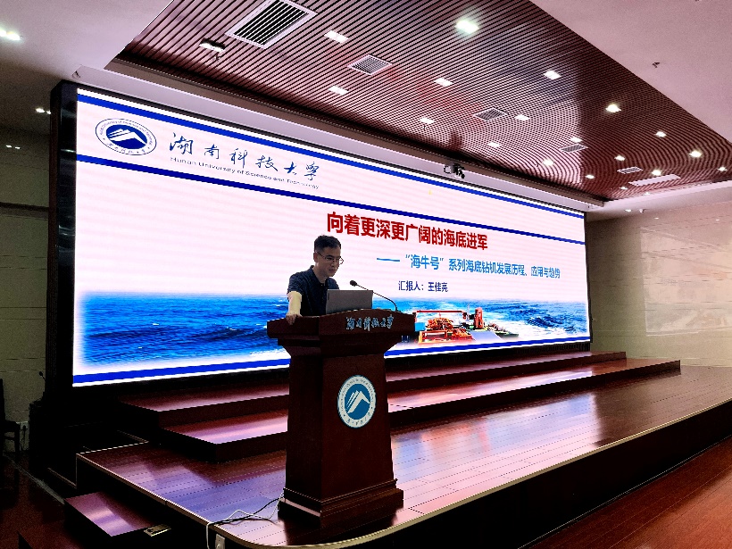 第三站,集训营成员在立德楼五楼报告厅观看了时代楷模、公司“海牛”团队负责人万步炎教授的先进事迹影片。随后,公司“海牛”团队成员代表王佳亮副教授给大家带来题为《向着更深更广阔的海底进军——“海牛号”系列海底钻机发展历程、应用与趋势》的报告,他从海洋强国时代意蕴、海洋取样技术简介、海底钻研技术简介、海底钻机工程案例、海底钻机社会影响等六个方面详细介绍了“海牛号”,并寄语同学们努力学习,向着更高的目标实现自己的理想。