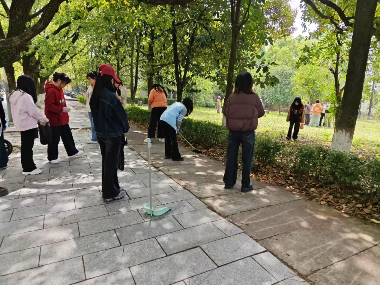 ▲同学们共同打扫敏行楼和柚子园卫生