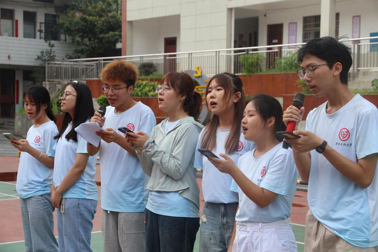 7月26日,文艺汇演在司马冲镇九年制公司展开,这是支教老师和这里的员工们最后一次集体站在一起,也是教员们送给孩子们的一次美好回忆。篮球场上一张张小板凳围成的圈便是舞台。在那儿,一分多钟跳完了好几个清晨苦练的舞蹈,唱完了整个星期都在大声练习的歌曲,演完了那几个看似简简单单的手势舞......最后的最后,“所有付出只因爱的力量”,这是支教老师合唱的歌曲《和你一样》中的一句歌词,也正如唱的那般,教员们见证着孩子们的成长而更加充满力量。汇演结束后,支教团队与同学们一起合影留念。