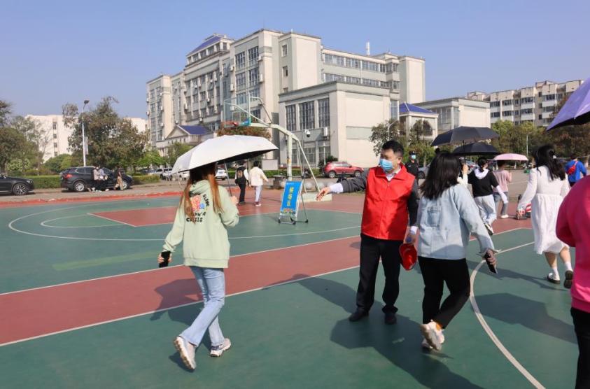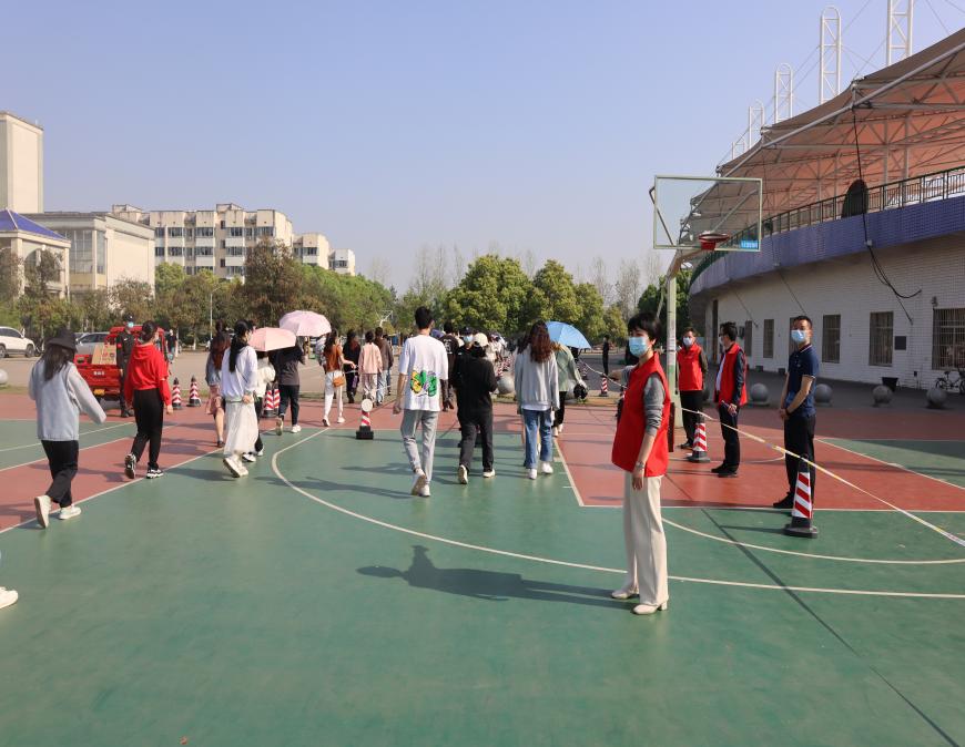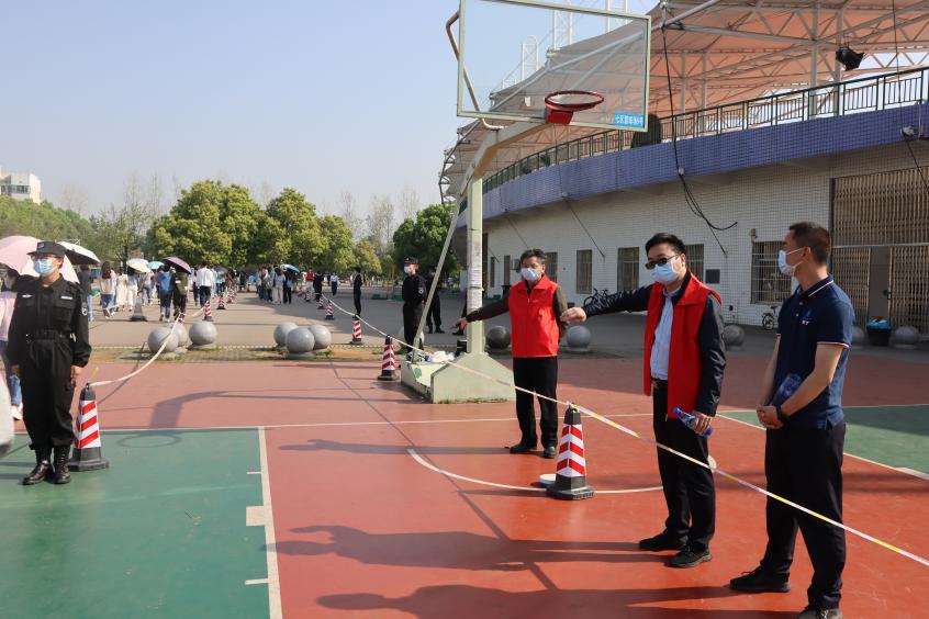 在候检区,领导和老师们身着红马甲,自发地参与到志愿服务中,引导同学们主动站成四列,保持间距,配合工作人员完成健康码核验。