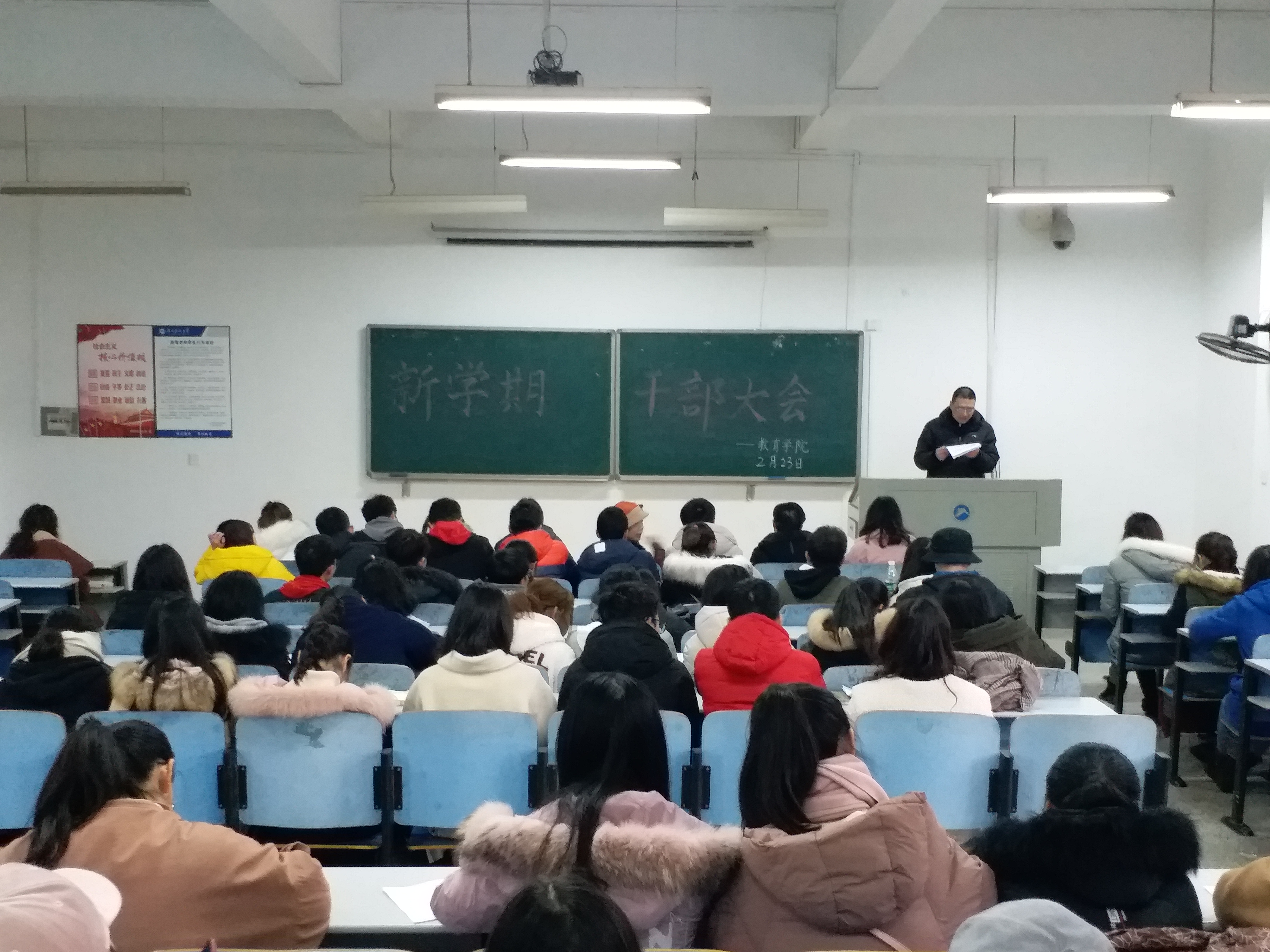 2019年2月23日下午5点,永利3044集团官网于八教3-6举行新学期干部大会,党委副书记刘辉亚、学工办老师李涛、尹琼芳、练素华等出席会议,15-18级员工干部参与会议。